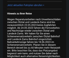 Doch es zeigt sich schon einige Tage vorher, es wird wohl nicht ganz so entspannt werden. Die Benachrichtigung, dass aufgrund von Unwettern und Murgängen zwischen Landeck-Zams und Ötztal auf ein Schienenersatzverkehr umgestiegen werden muss, erreicht mich etwa eine Woche vor Abfahrt.