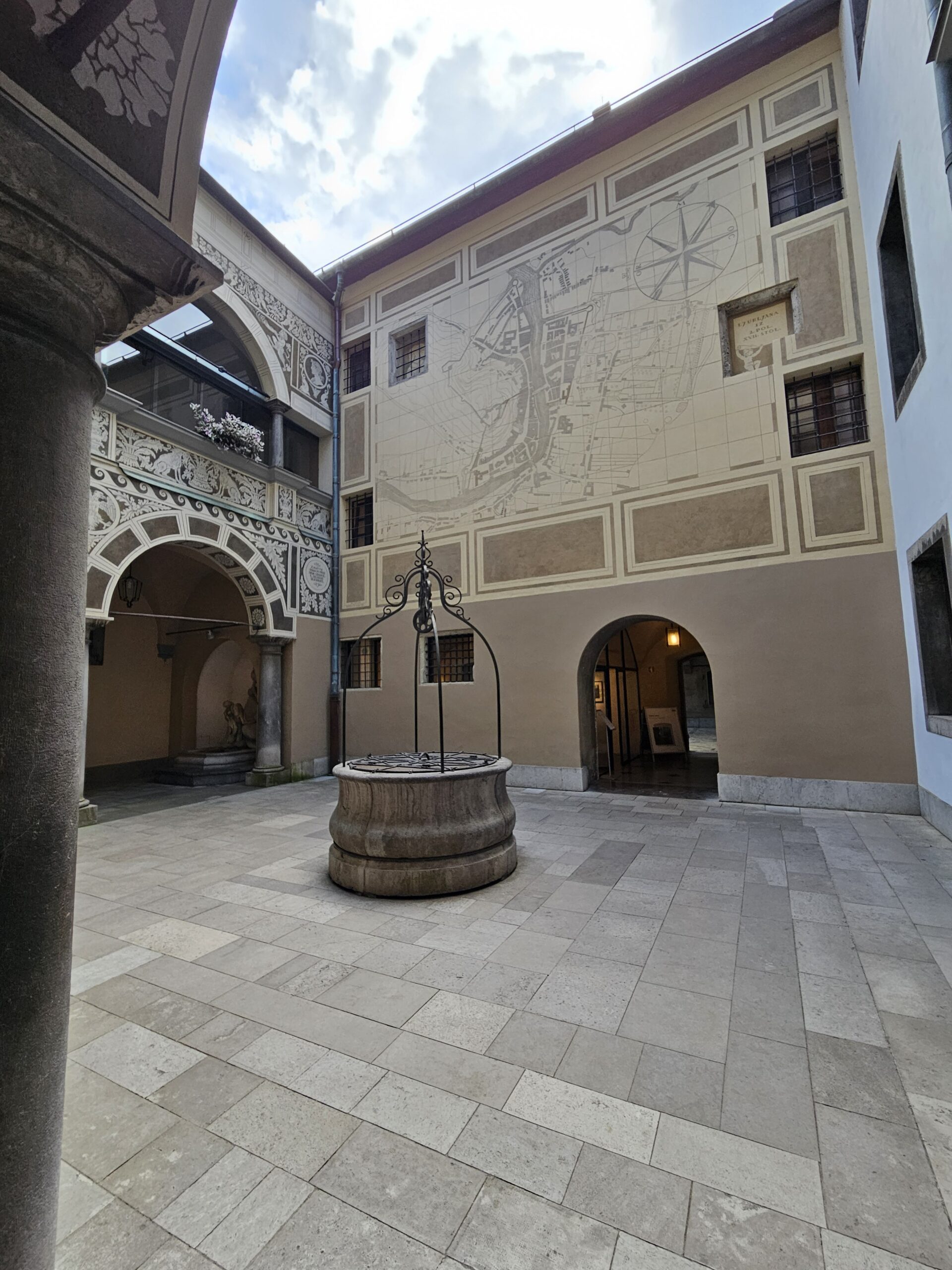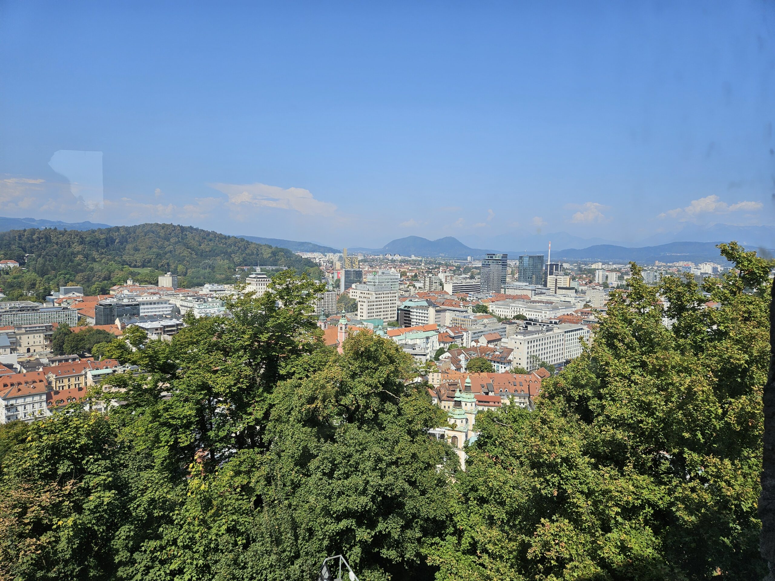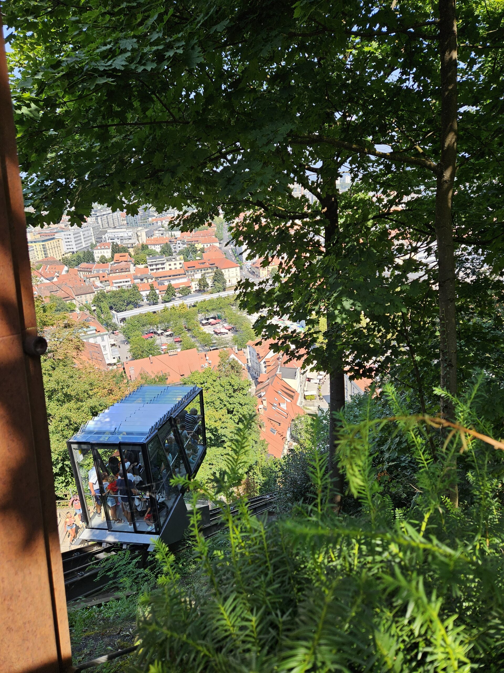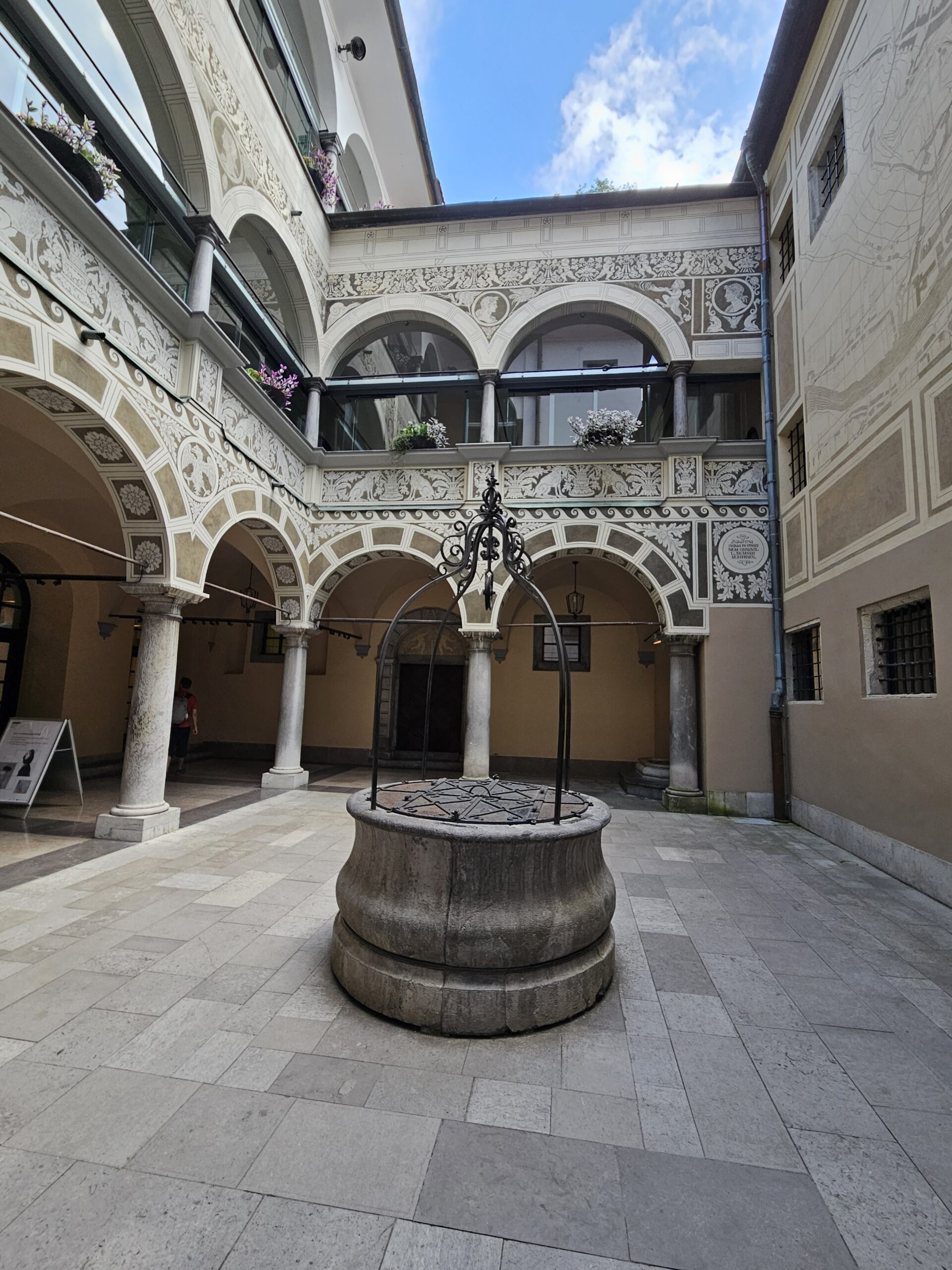 Kurz darauf erreichen wir den Bahnhof. Es gibt Gepäckfächer und beim davor liegenden Busbahnhof auch eine Gepäckaufbewahrungsstelle. Für den morgigen Abreisetag ist dies gut zu wissen, Check-out ist um 11 Uhr, Zugabfahrt um 22.13 Uhr, wir haben also noch etwas Zeit… Nach unserer Recherche spazieren wir wieder in die Altstadt, zum Markt und schlendern dort etwas herum, kaufen einen Becher gemischte Beeren, denn wir beim Flanieren essen und setzen uns danach in ein Kaffee. Am Morgen so im Schatten ist es noch angenehm. Wir steigen einige Treppen hinunter und kommen zum Fischmarkt, Denise rümpft schon oben leicht die Nase, kommt aber mit. Wir schlendern dem Markthaus entlang und wieder zurück und genehmigen uns in einem Café an der Ljubljanica einen kalten Kaffee. Danach spazieren wir noch durch eine weitere Markthalle mit einigen Leckereien und suchen das Funiculaire. Nachdem wir es entdeckt haben, sind wir der Ansicht, es lohnt sich nicht, vollgestopft zwischen all den Menschen. Der Spaziergang nach oben ist deutlich kürzer wie in Braşov. Trotzdem suchen wir noch eine Einkaufsmöglichkeit um etwas zu Trinken dabei zu haben. Und nutzen auch gleich noch die öffentlichen Toiletten. Danach spazieren wir den eher steilen aber guten Weg hoch (heute haben wir die Turnschuhe an… in weiser Voraussicht 😉). Oben braucht Denise erstmal eine Verschnaufpause… Dann erkunden wir die Ljubljaner Burg. Sehr touristisch, in einige Bereiche kommt man nur mit Ticket, das sparen wir uns. Aussicht gibt es auch so, allerdings nicht gleich berauschend wie in Braşov. Dann spazieren wir einen anderen Weg nach unten und setzen uns gleich in die Pizzeria Piccola, an die wir unten heranlaufen. Es ist schon fast 13 Uhr und so essen wir nun je eine gute Pizza zu Mittag. Eine zu teilen hätte gereicht. In diesen Ferien lernen wir es nicht mehr. Dann flanieren wir zum Rathaus, das wir dann spontan noch kurz besichtigen und uns noch imposante Innenhöfe preisgibt.