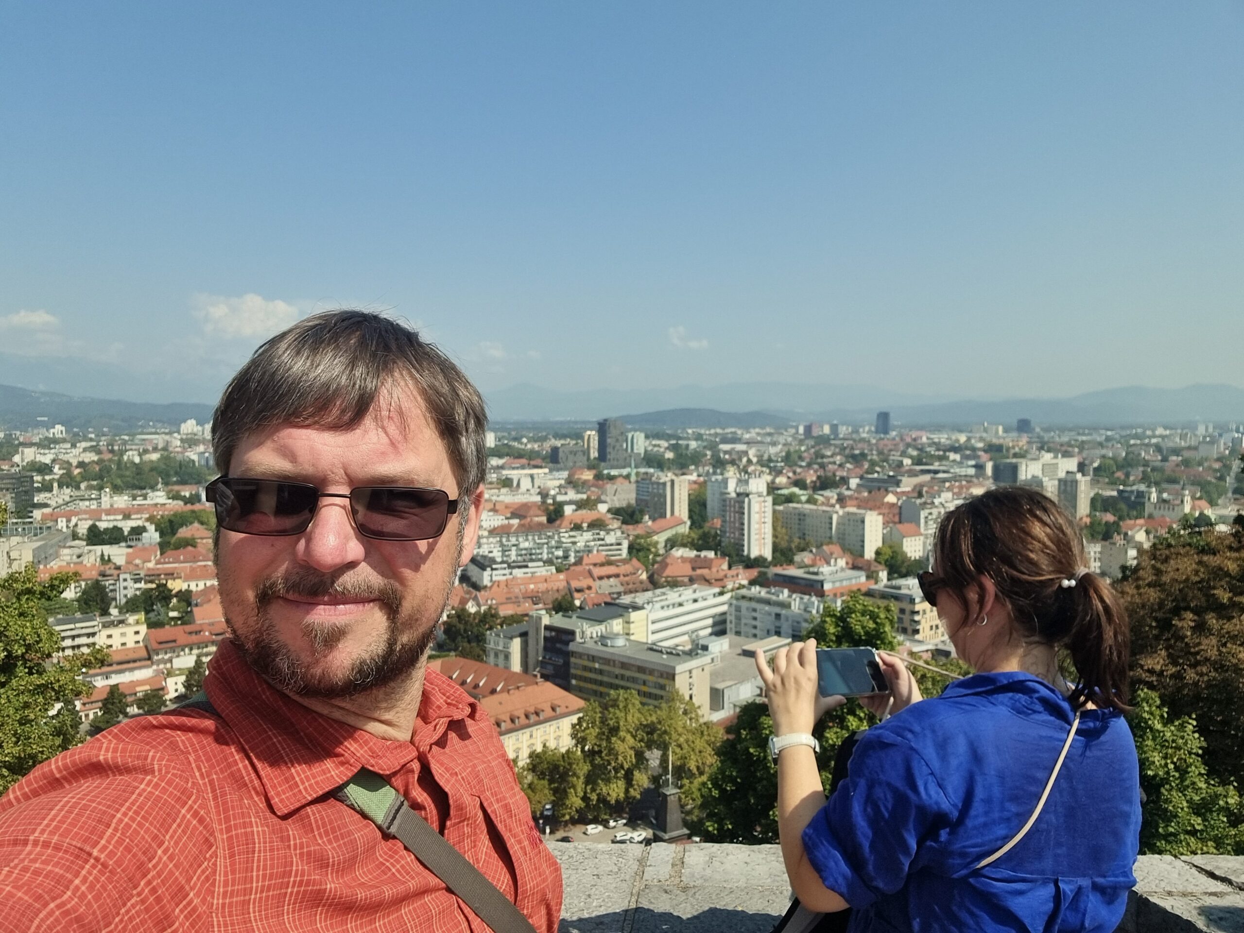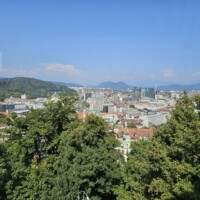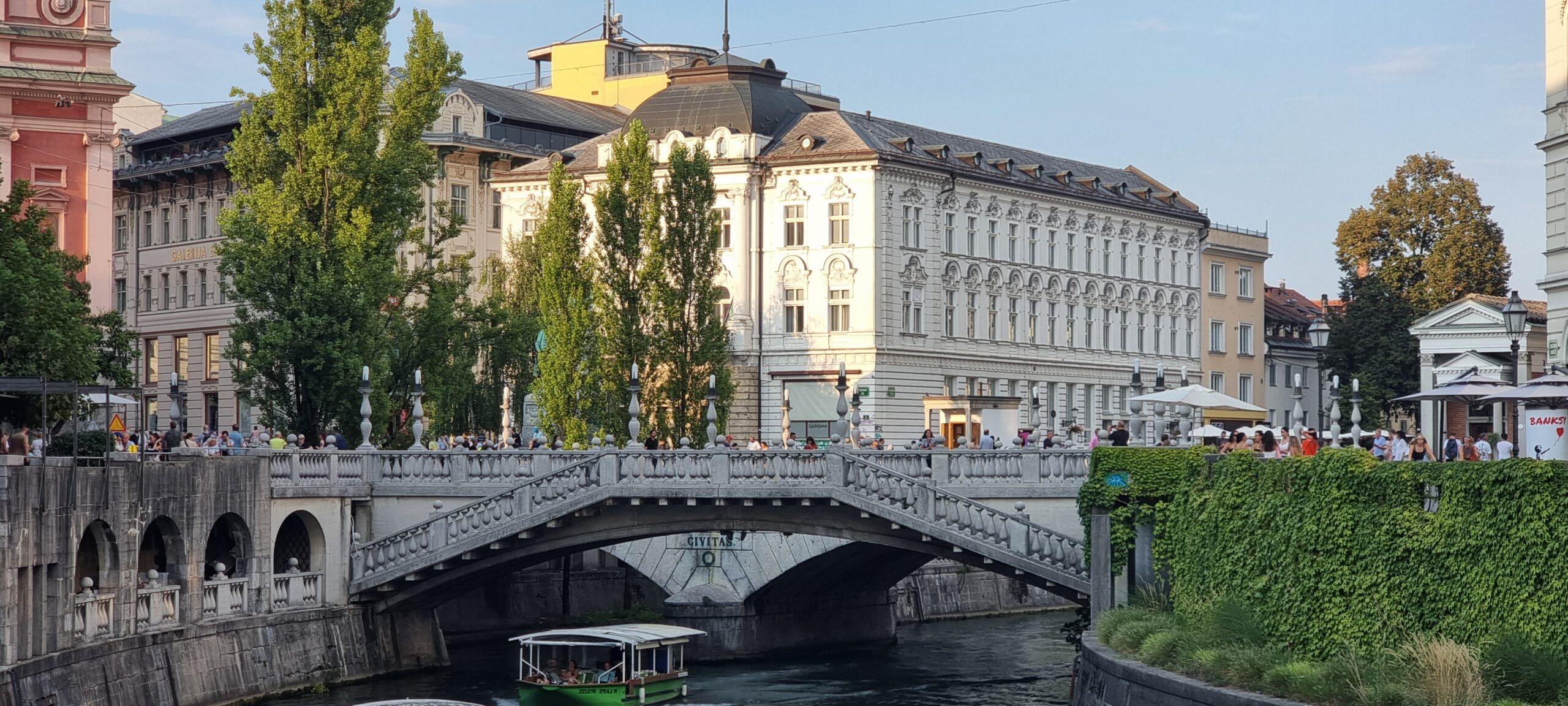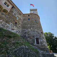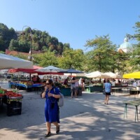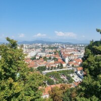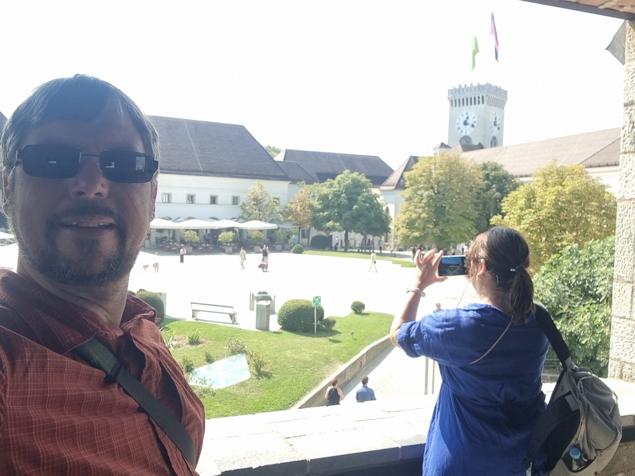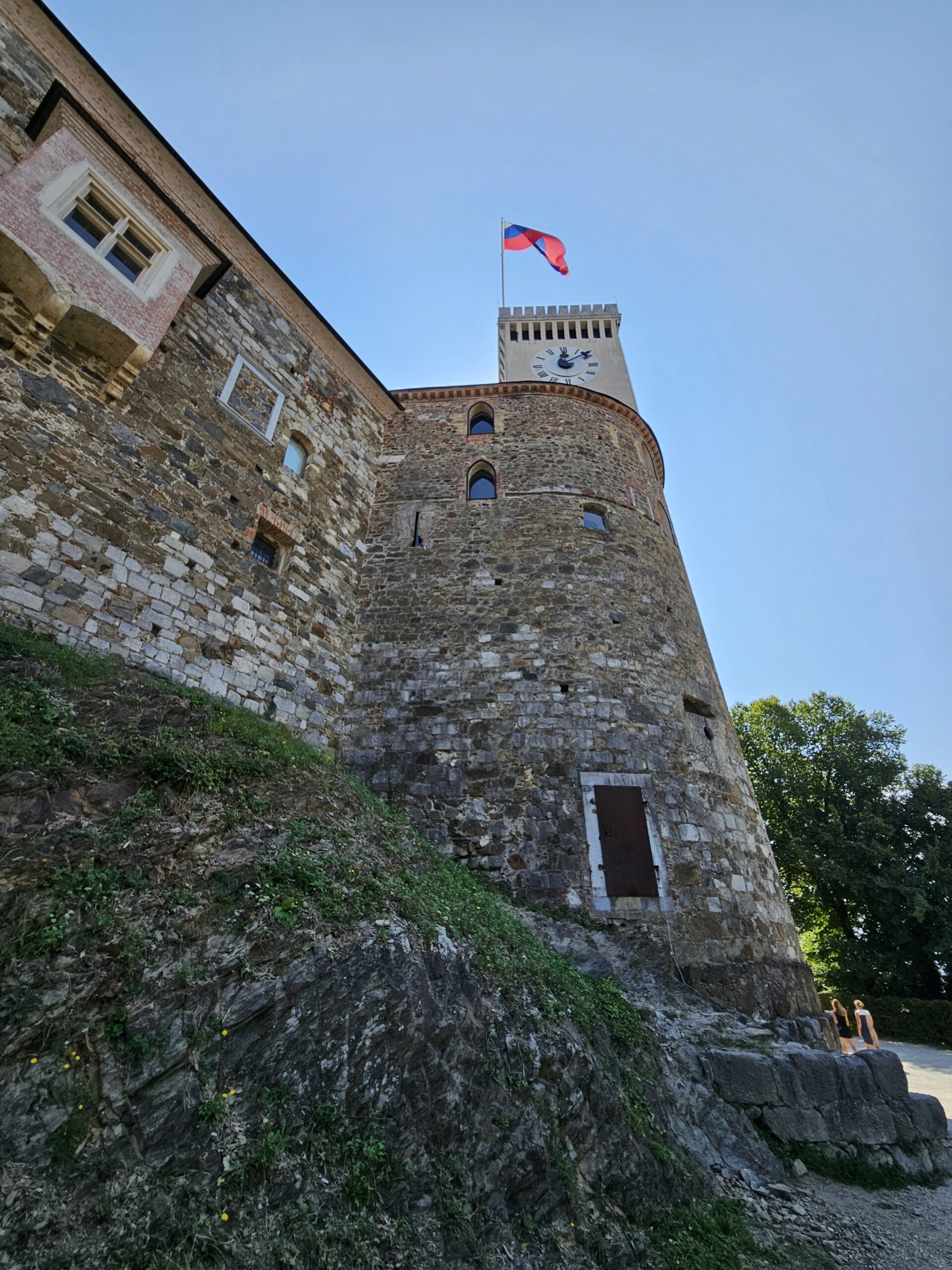Kurz darauf erreichen wir den Bahnhof. Es gibt Gepäckfächer und beim davor liegenden Busbahnhof auch eine Gepäckaufbewahrungsstelle. Für den morgigen Abreisetag ist dies gut zu wissen, Check-out ist um 11 Uhr, Zugabfahrt um 22.13 Uhr, wir haben also noch etwas Zeit… Nach unserer Recherche spazieren wir wieder in die Altstadt, zum Markt und schlendern dort etwas herum, kaufen einen Becher gemischte Beeren, denn wir beim Flanieren essen und setzen uns danach in ein Kaffee. Am Morgen so im Schatten ist es noch angenehm. Wir steigen einige Treppen hinunter und kommen zum Fischmarkt, Denise rümpft schon oben leicht die Nase, kommt aber mit. Wir schlendern dem Markthaus entlang und wieder zurück und genehmigen uns in einem Café an der Ljubljanica einen kalten Kaffee. Danach spazieren wir noch durch eine weitere Markthalle mit einigen Leckereien und suchen das Funiculaire. Nachdem wir es entdeckt haben, sind wir der Ansicht, es lohnt sich nicht, vollgestopft zwischen all den Menschen. Der Spaziergang nach oben ist deutlich kürzer wie in Braşov. Trotzdem suchen wir noch eine Einkaufsmöglichkeit um etwas zu Trinken dabei zu haben. Und nutzen auch gleich noch die öffentlichen Toiletten. Danach spazieren wir den eher steilen aber guten Weg hoch (heute haben wir die Turnschuhe an… in weiser Voraussicht 😉). Oben braucht Denise erstmal eine Verschnaufpause… Dann erkunden wir die Ljubljaner Burg. Sehr touristisch, in einige Bereiche kommt man nur mit Ticket, das sparen wir uns. Aussicht gibt es auch so, allerdings nicht gleich berauschend wie in Braşov. Dann spazieren wir einen anderen Weg nach unten und setzen uns gleich in die Pizzeria Piccola, an die wir unten heranlaufen. Es ist schon fast 13 Uhr und so essen wir nun je eine gute Pizza zu Mittag. Eine zu teilen hätte gereicht. In diesen Ferien lernen wir es nicht mehr. Dann flanieren wir zum Rathaus, das wir dann spontan noch kurz besichtigen und uns noch imposante Innenhöfe preisgibt.