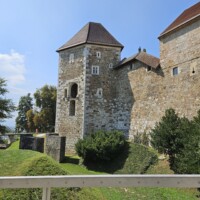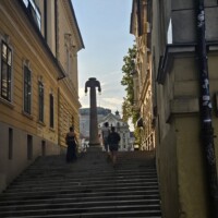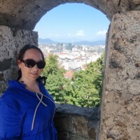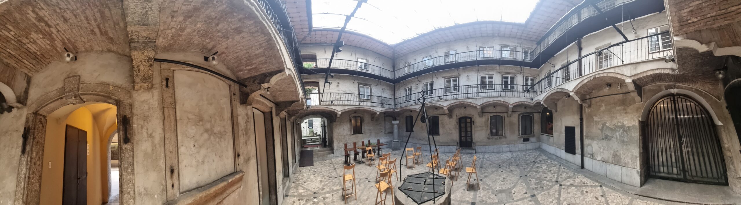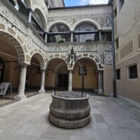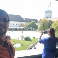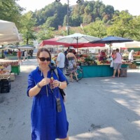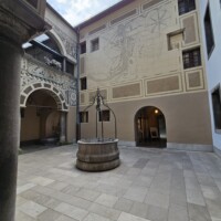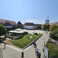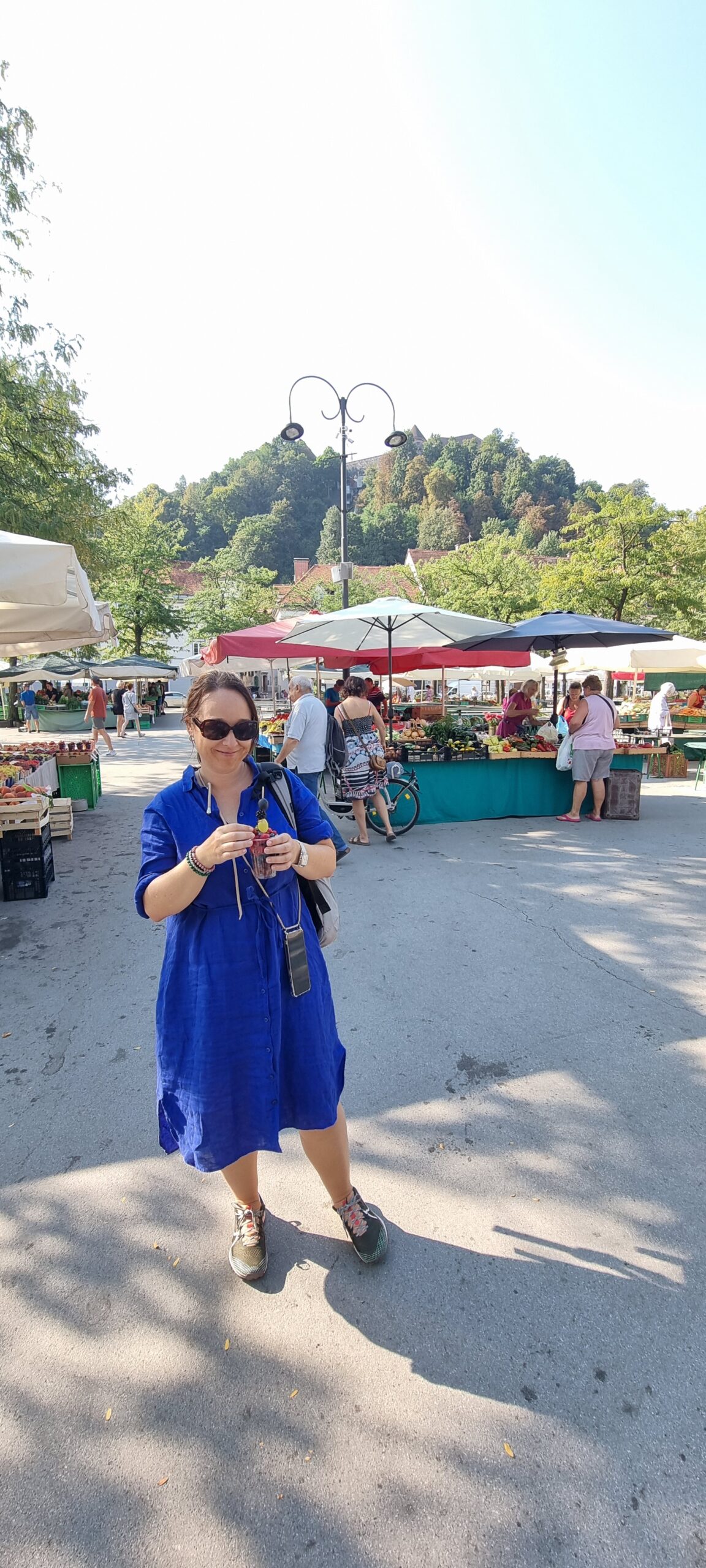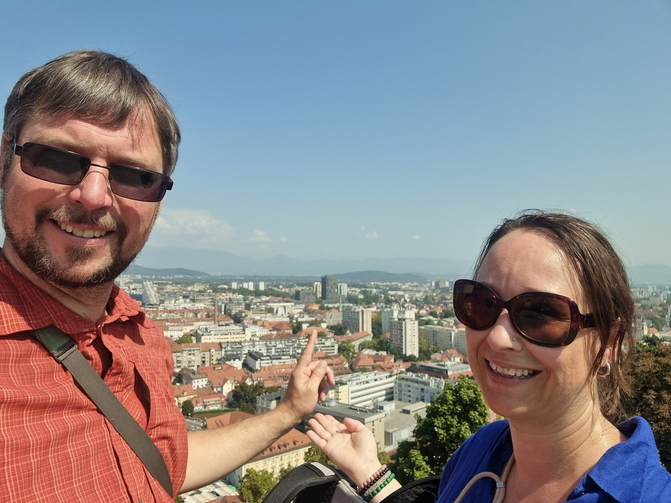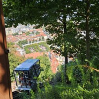 Kurz darauf erreichen wir den Bahnhof. Es gibt Gepäckfächer und beim davor liegenden Busbahnhof auch eine Gepäckaufbewahrungsstelle. Für den morgigen Abreisetag ist dies gut zu wissen, Check-out ist um 11 Uhr, Zugabfahrt um 22.13 Uhr, wir haben also noch etwas Zeit… Nach unserer Recherche spazieren wir wieder in die Altstadt, zum Markt und schlendern dort etwas herum, kaufen einen Becher gemischte Beeren, denn wir beim Flanieren essen und setzen uns danach in ein Kaffee. Am Morgen so im Schatten ist es noch angenehm. Wir steigen einige Treppen hinunter und kommen zum Fischmarkt, Denise rümpft schon oben leicht die Nase, kommt aber mit. Wir schlendern dem Markthaus entlang und wieder zurück und genehmigen uns in einem Café an der Ljubljanica einen kalten Kaffee. Danach spazieren wir noch durch eine weitere Markthalle mit einigen Leckereien und suchen das Funiculaire. Nachdem wir es entdeckt haben, sind wir der Ansicht, es lohnt sich nicht, vollgestopft zwischen all den Menschen. Der Spaziergang nach oben ist deutlich kürzer wie in Braşov. Trotzdem suchen wir noch eine Einkaufsmöglichkeit um etwas zu Trinken dabei zu haben. Und nutzen auch gleich noch die öffentlichen Toiletten. Danach spazieren wir den eher steilen aber guten Weg hoch (heute haben wir die Turnschuhe an… in weiser Voraussicht 😉). Oben braucht Denise erstmal eine Verschnaufpause… Dann erkunden wir die Ljubljaner Burg. Sehr touristisch, in einige Bereiche kommt man nur mit Ticket, das sparen wir uns. Aussicht gibt es auch so, allerdings nicht gleich berauschend wie in Braşov. Dann spazieren wir einen anderen Weg nach unten und setzen uns gleich in die Pizzeria Piccola, an die wir unten heranlaufen. Es ist schon fast 13 Uhr und so essen wir nun je eine gute Pizza zu Mittag. Eine zu teilen hätte gereicht. In diesen Ferien lernen wir es nicht mehr. Dann flanieren wir zum Rathaus, das wir dann spontan noch kurz besichtigen und uns noch imposante Innenhöfe preisgibt.