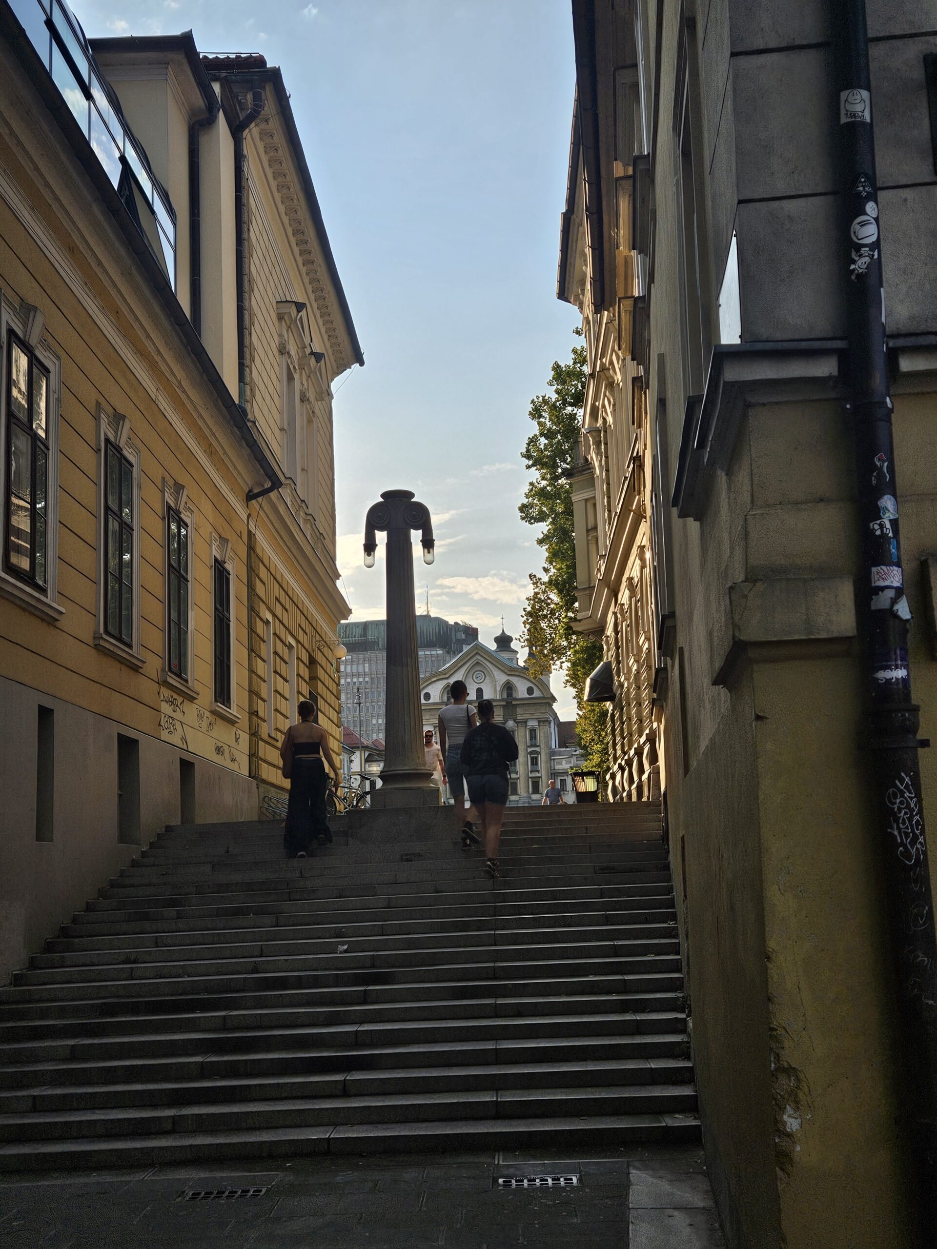 Infolge der gestrigen Frühstücksbuffeterfahrung geht unser Wecker heute um 07.00 Uhr. 07.35 Uhr sind wir im Frühstücksraum, fünf Minuten nach Beginn der Frühstückszeit. Der Raum ist schon gut gefüllt 🫣, aber das Buffet immerhin auch noch 😅. Wir wählen einen Platz etwas näher beim Buffet und essen uns fürs Erste satt. Danach nochmals kurz ins Zimmer und dann gehen wir los. Erster Zielort ist der Bahnhof zur Erkundung der Gepäckaufbewahrungssituation. Unterwegs kommen wir noch am Künstlerviertel Metelkova vorbei.
