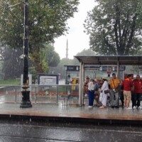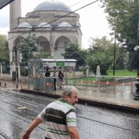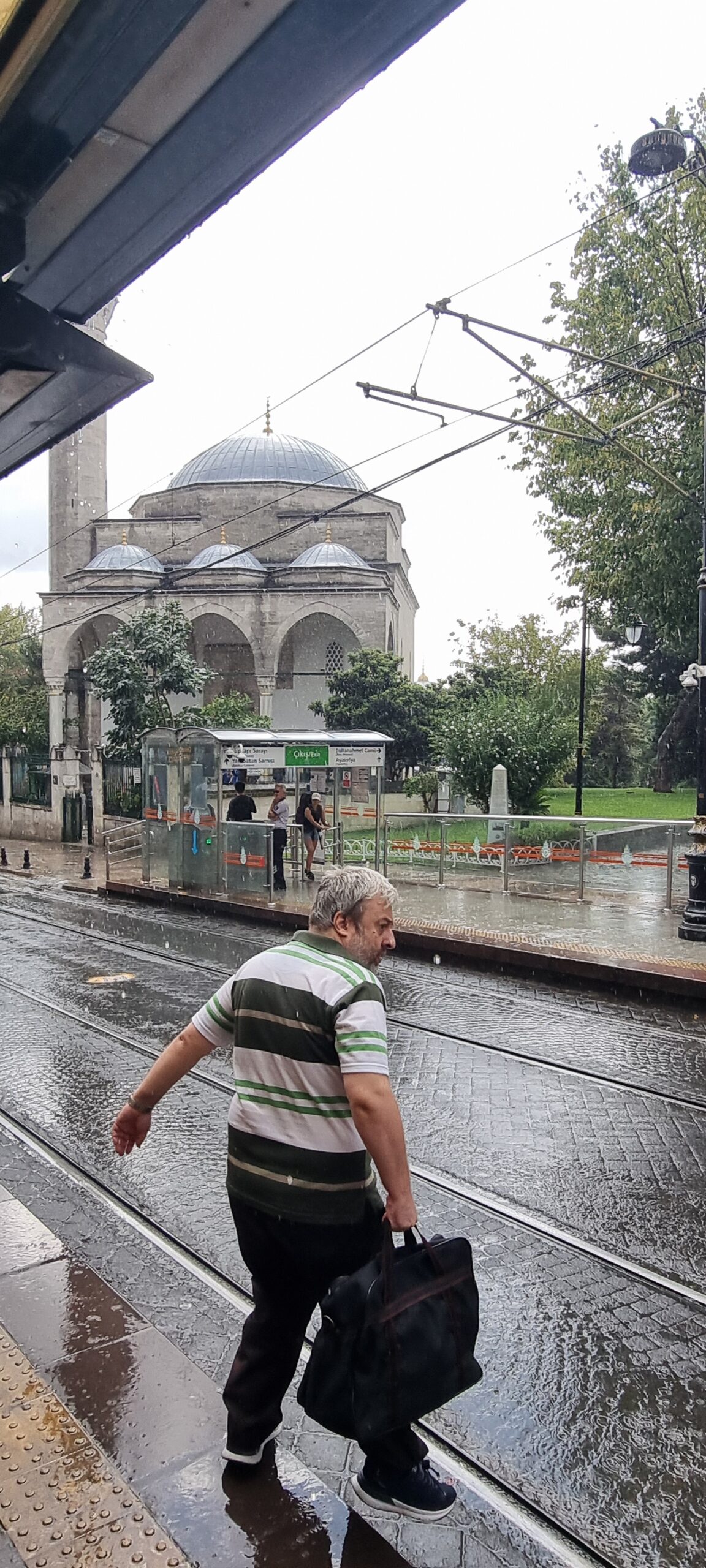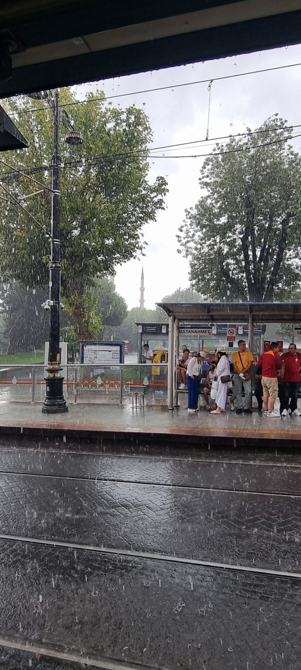 Heute gehen wir vergleichsweise früh los, wir wollen die Hagia Sophia und/oder die Blaue Moschee (Sultanahmet-Moschee) besuchen und vorher noch frühstücken. Wir nehmen wieder die Tünel-Metro nach Karaköy und dort gehen wir aufs Tram. In den wenigen Minuten Wartezeit in der Sonne braten wir schon wieder leicht. Das Tram ist kaum losgefahren und auf der Galatbrücke, als wir sehen, wie der Regen von hinten naht und uns bald einholt. Es schüttet. Trotzdem steigen wir dann planmässig bei der Haltestelle Sultanahmet aus, bleiben aber, wie einige andere, unter dem Tramhäuschen stehen. Der Regen nimmt etwas ab… und wieder zu… auf der Strasse und den Tramgeleisen fliessen kleine Bäche herunter, es werden schon Eingangsteppiche von Läden mit gespült. Die Läden haben schnell ihre Schirme und Regenpellerinen hervorgeholt und verkaufen fleissig.