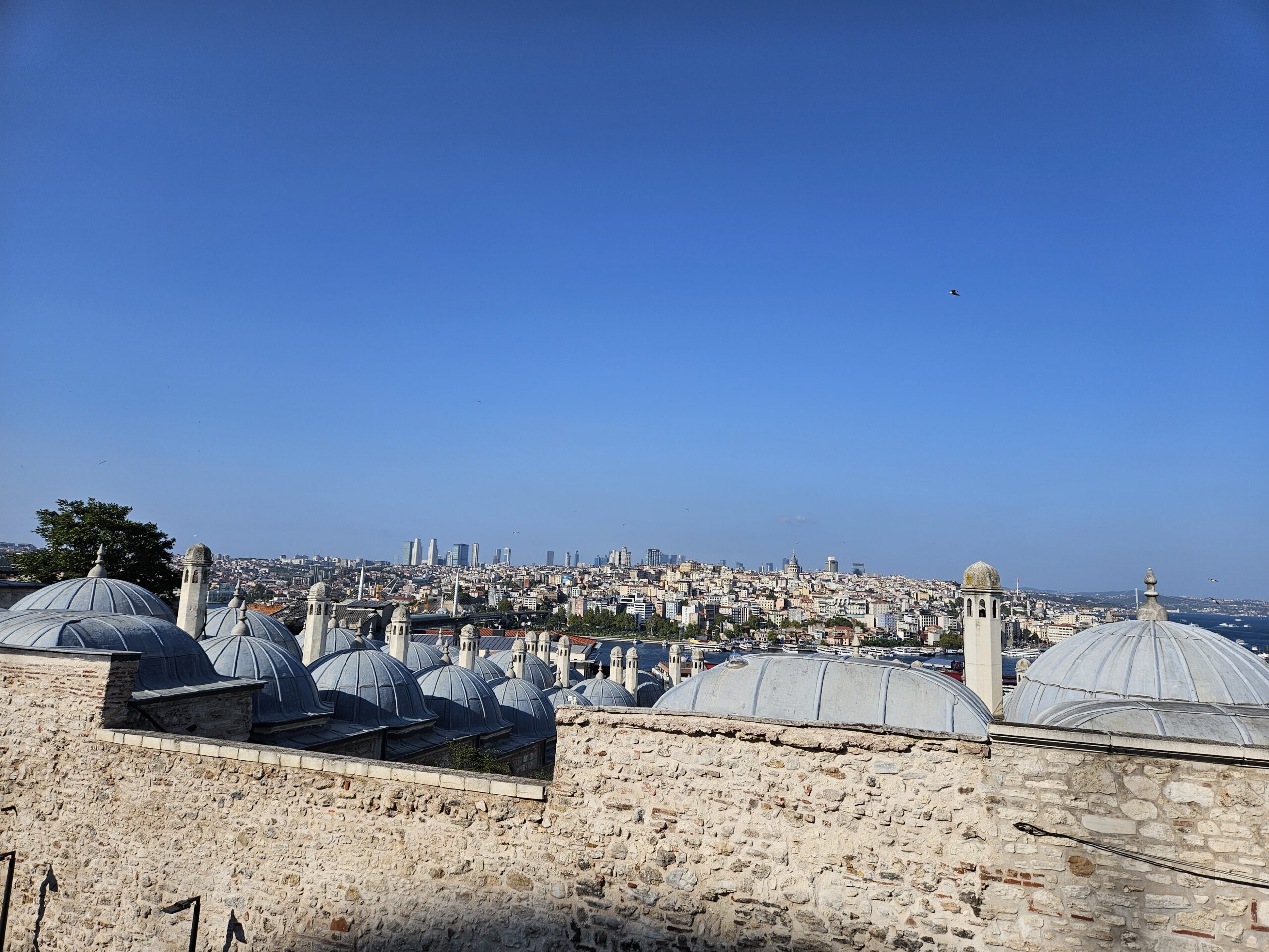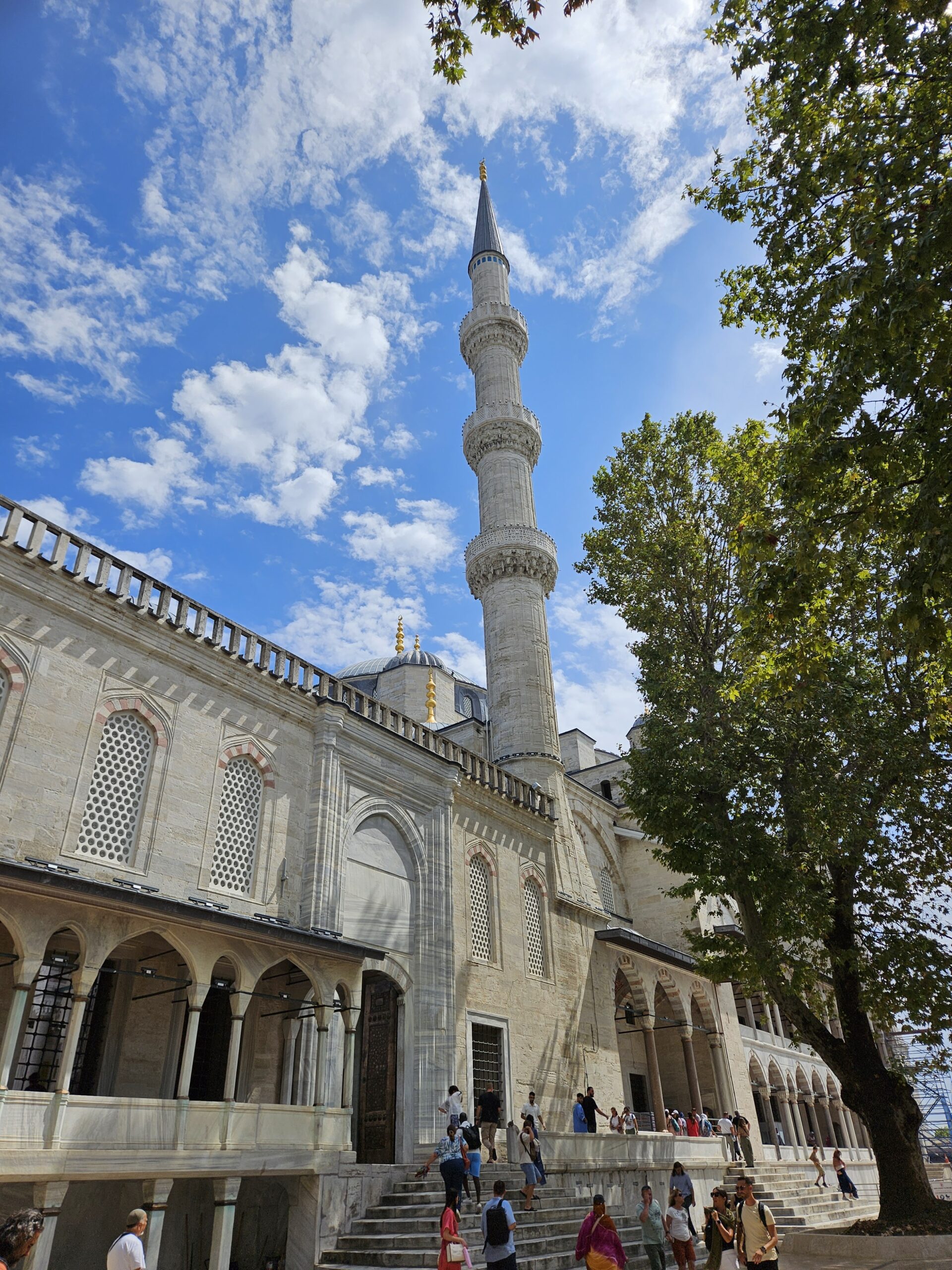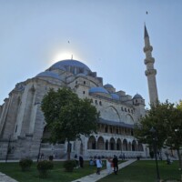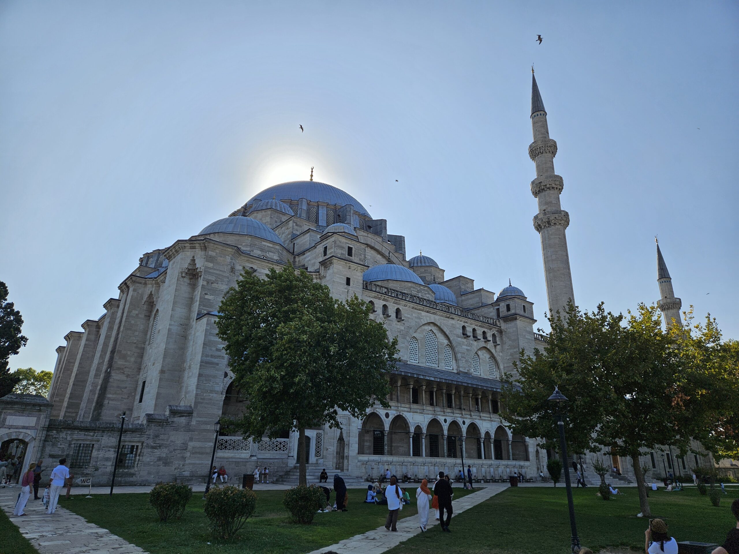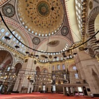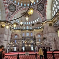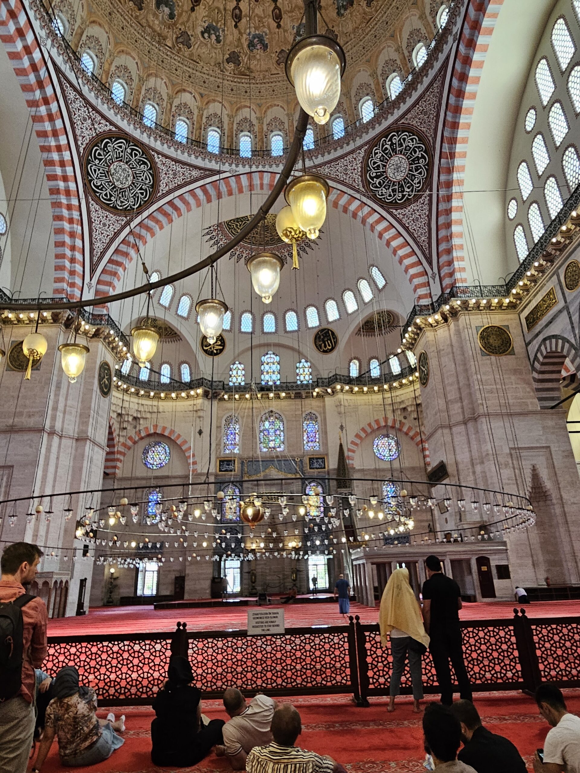 Nach dieser Stärkung gehen wir, wieder mit dem Tram, zur Blauen Moschee, es ist so um 12 Uhr und die Moschee daher aktuell für Besucher geschlossen. Zudem sind für Männer lange Hosen vorgeschrieben, ich trage jedoch kurze Hosen 🤷🏻♂️. Also erneut Planänderung. Zu einem Markt auf Souvenirjagd (auf Empfehlung von Denises Cousine nicht auf dem Grossen Basar, sondern einem günstigeren, dem Şark Han. Nicht schön, aber günstig 😆 und dasselbe wie auf dem touristisch stark frequentierten Grossen Basar). Wieder mit dem Tram geht’s zu Eminönü und von dort zu Fuss zu Şark Han. Einige Souvenirs und Mitbringsel können zu Spottpreisen erworben werden 🤑🤑🤑. Dann weiter, eine kleine Stärkung ist notwendig und wir kehren, nach einem kurzen Geldwechsel, in einer nahen hübschen (und teuren) Brasserie auf Cola und Limonade ein und nutzen dies auch als WC-Pause. Den Plan, zurück ins Hotel damit ich lange Hosen anziehen kann, verwerfen wir und wollen hier in den Marktgassen günstig Hosen kaufen. Nicht ganz so leicht, wie gedacht, für Frauen gibt es alles, für Männer mehrheitlich T-Shirt, Trainer (ist dann doch zu heiss…) und Anzüge. Doch ich werde fündig und erwerbe eine günstige lange Hose. So gerüstet sollte nun, kurz vor 15 Uhr, einem Moschee-Besuch nichts mehr im Wege stehen. Aufgrund unserer aktuellen Nähe, einer weiteren Empfehlung von Denises Cousine wie auch unseres Reiseführers, gehen wir zuerst in die Süleymaniye-Moschee. Denise war im Oman auch schon in einer Moschee, ich noch nie. Wir finden den Besuchereingang, ziehen unsere Schuhe aus, ich meine lange Hose über die kurze und Denise ihr Kopftuch an, dann gehen wir in die Moschee. Sie ist eindrucksvoll, gross, hoch und mich beeindruckt auch der Teppich, so weich 😀. Wir schauen uns ein wenig um und sehen uns die aufgelegte (verschiedenstsprachige) Literatur an. Und werden bald auf Englisch angesprochen, ob wir kurz Zeit hätten, sie würde uns etwas über den Islam erzählen. Nun ja, wir haben kurz Zeit und so sitzen wir kurz darauf mit ihr und ihrer Tochter auf dem Boden der Moschee. Sie erzählt viel über den Islam, alles in gutem Englisch. Es ist interessant und die Zeit vergeht. Es nimmt mit der Zeit Züge des Missionierens an, wir bleiben höflich, sind jedoch nicht konvertiert. Wie lange wir da gesessen und zugehört haben wissen wir nicht, sicher über eine Stunde. Kurz vor dem Nachmittagsgebet, so etwa 16.40 Uhr, verabschieden wir uns und verlassen die Moschee. Wir sind nicht lange draussen, als bereits zum Gebet gerufen wird.