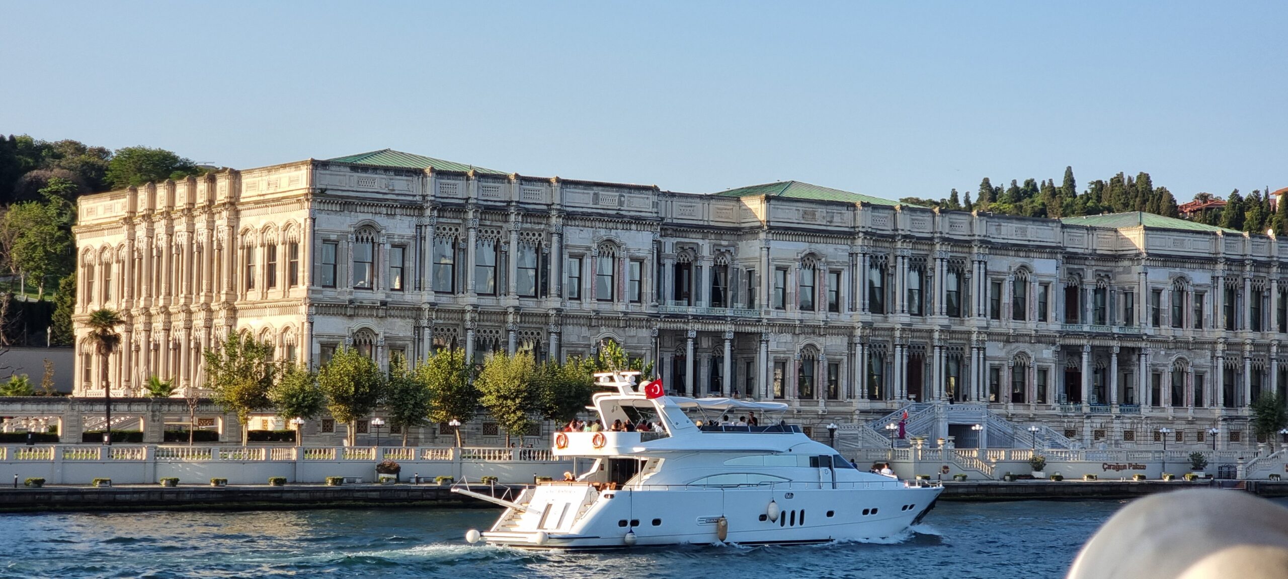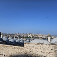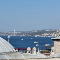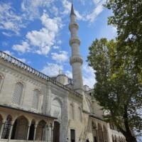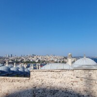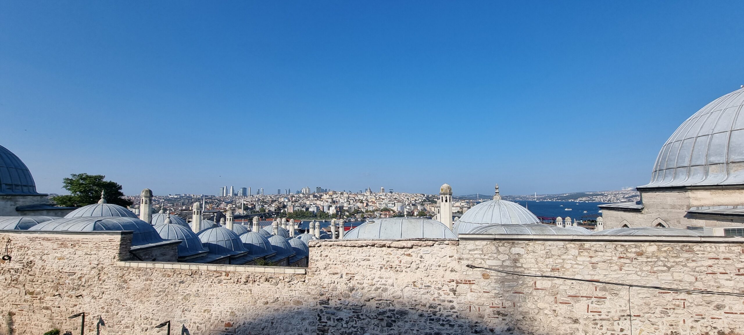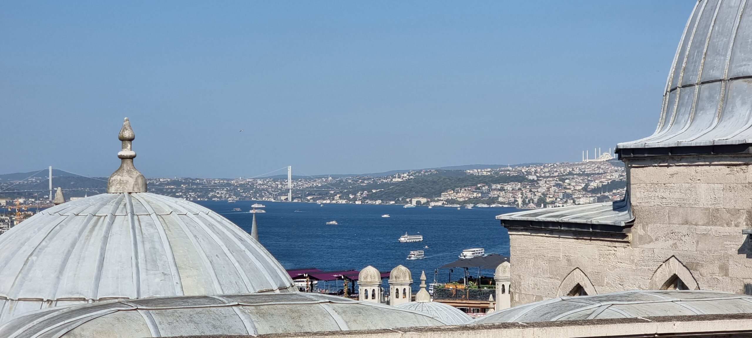Nach dieser Stärkung gehen wir, wieder mit dem Tram, zur Blauen Moschee, es ist so um 12 Uhr und die Moschee daher aktuell für Besucher geschlossen. Zudem sind für Männer lange Hosen vorgeschrieben, ich trage jedoch kurze Hosen 🤷🏻♂️. Also erneut Planänderung. Zu einem Markt auf Souvenirjagd (auf Empfehlung von Denises Cousine nicht auf dem Grossen Basar, sondern einem günstigeren, dem Şark Han. Nicht schön, aber günstig 😆 und dasselbe wie auf dem touristisch stark frequentierten Grossen Basar). Wieder mit dem Tram geht’s zu Eminönü und von dort zu Fuss zu Şark Han. Einige Souvenirs und Mitbringsel können zu Spottpreisen erworben werden 🤑🤑🤑. Dann weiter, eine kleine Stärkung ist notwendig und wir kehren, nach einem kurzen Geldwechsel, in einer nahen hübschen (und teuren) Brasserie auf Cola und Limonade ein und nutzen dies auch als WC-Pause. Den Plan, zurück ins Hotel damit ich lange Hosen anziehen kann, verwerfen wir und wollen hier in den Marktgassen günstig Hosen kaufen. Nicht ganz so leicht, wie gedacht, für Frauen gibt es alles, für Männer mehrheitlich T-Shirt, Trainer (ist dann doch zu heiss…) und Anzüge. Doch ich werde fündig und erwerbe eine günstige lange Hose. So gerüstet sollte nun, kurz vor 15 Uhr, einem Moschee-Besuch nichts mehr im Wege stehen. Aufgrund unserer aktuellen Nähe, einer weiteren Empfehlung von Denises Cousine wie auch unseres Reiseführers, gehen wir zuerst in die Süleymaniye-Moschee. Denise war im Oman auch schon in einer Moschee, ich noch nie. Wir finden den Besuchereingang, ziehen unsere Schuhe aus, ich meine lange Hose über die kurze und Denise ihr Kopftuch an, dann gehen wir in die Moschee. Sie ist eindrucksvoll, gross, hoch und mich beeindruckt auch der Teppich, so weich 😀. Wir schauen uns ein wenig um und sehen uns die aufgelegte (verschiedenstsprachige) Literatur an. Und werden bald auf Englisch angesprochen, ob wir kurz Zeit hätten, sie würde uns etwas über den Islam erzählen. Nun ja, wir haben kurz Zeit und so sitzen wir kurz darauf mit ihr und ihrer Tochter auf dem Boden der Moschee. Sie erzählt viel über den Islam, alles in gutem Englisch. Es ist interessant und die Zeit vergeht. Es nimmt mit der Zeit Züge des Missionierens an, wir bleiben höflich, sind jedoch nicht konvertiert. Wie lange wir da gesessen und zugehört haben wissen wir nicht, sicher über eine Stunde. Kurz vor dem Nachmittagsgebet, so etwa 16.40 Uhr, verabschieden wir uns und verlassen die Moschee. Wir sind nicht lange draussen, als bereits zum Gebet gerufen wird.