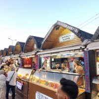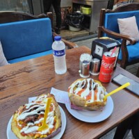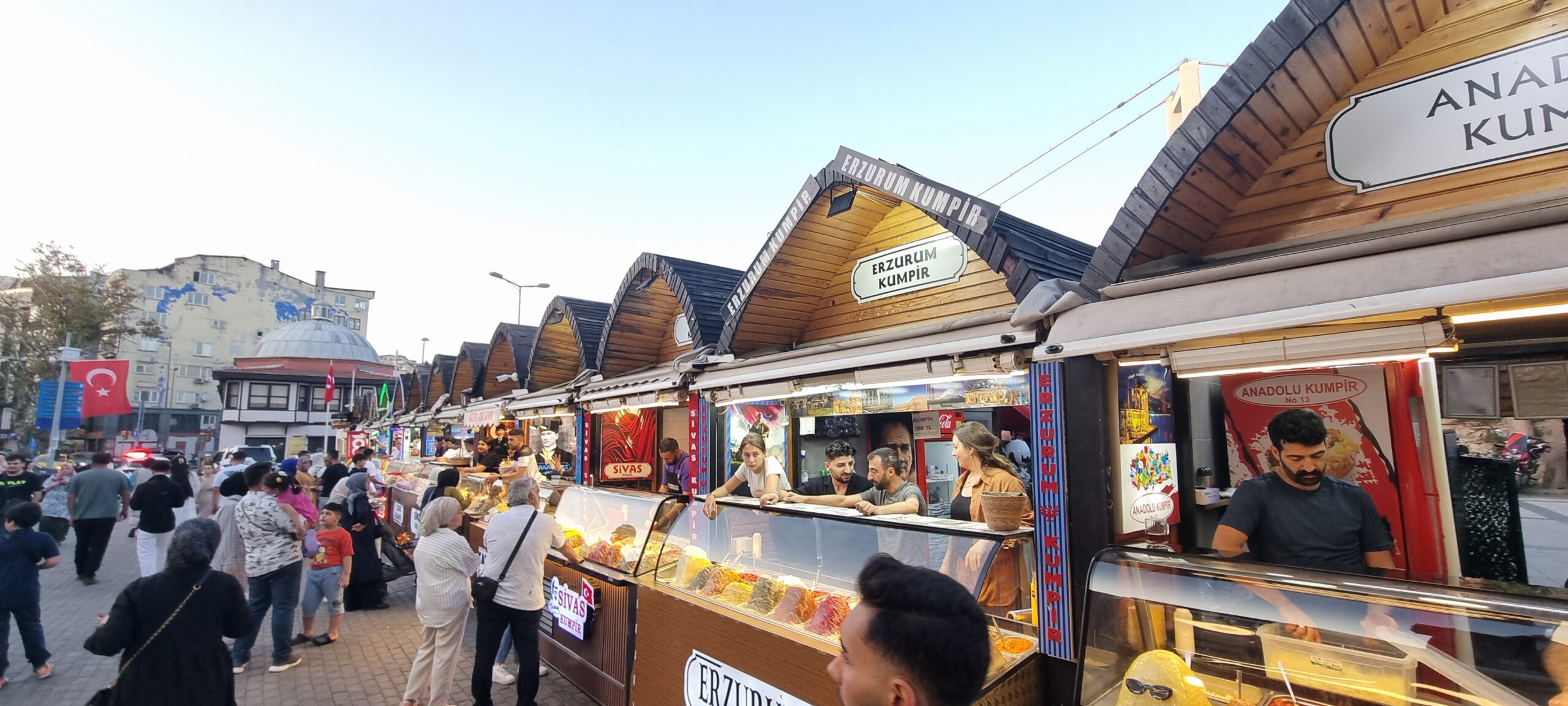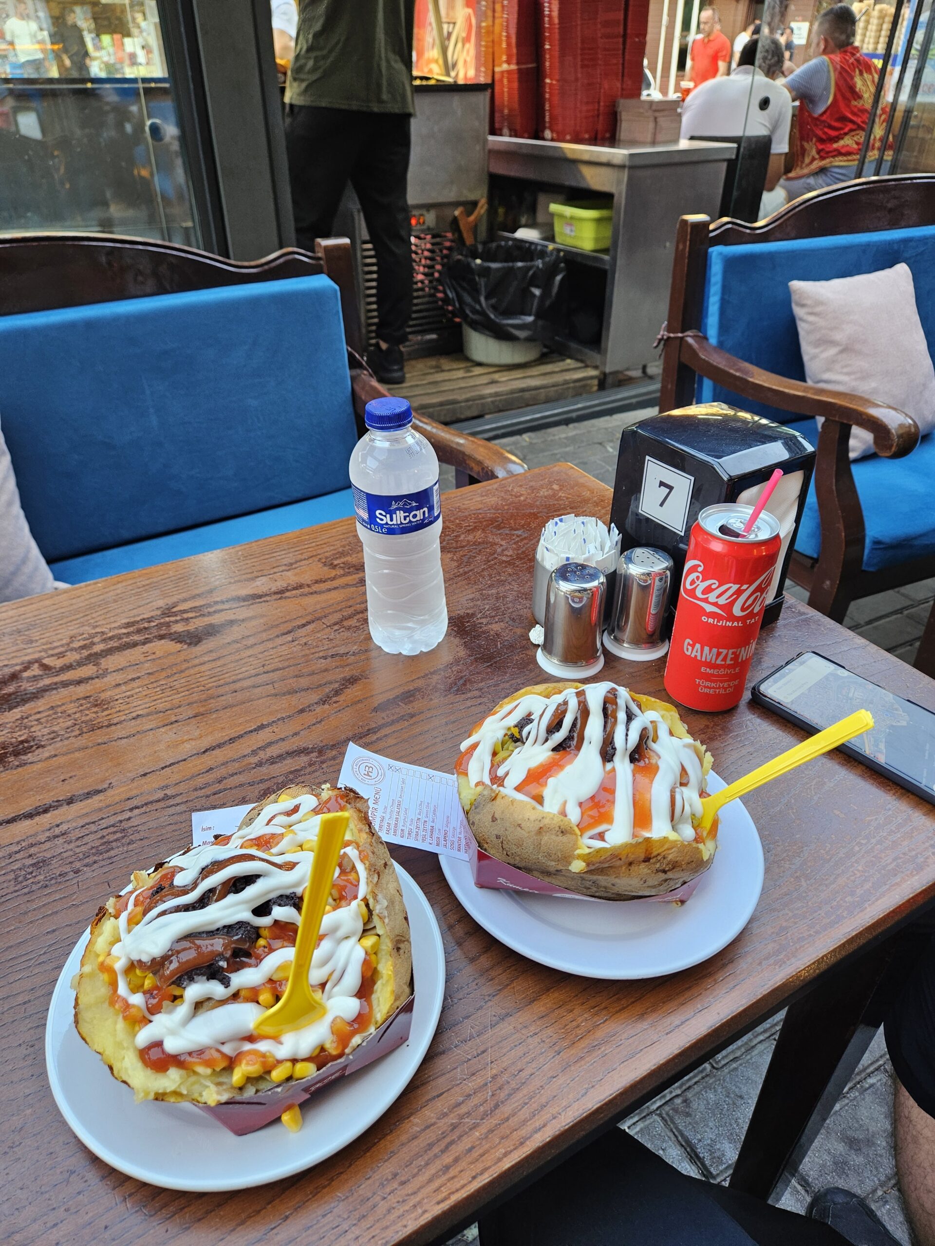 Kurz darauf sind wir bei den Kumpir-Ständen angelangt, setzen uns aber in ein Restaurant und bestellen uns da Kumpir. Es geht nicht lange und sie stehen vor uns 😋.