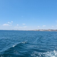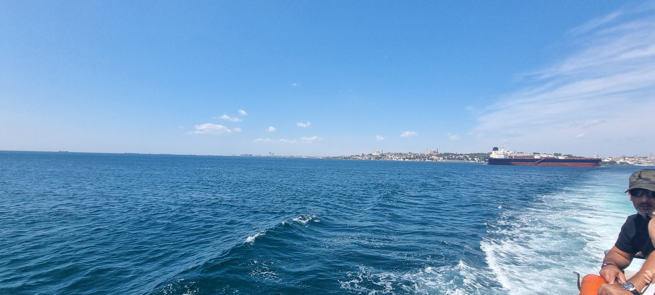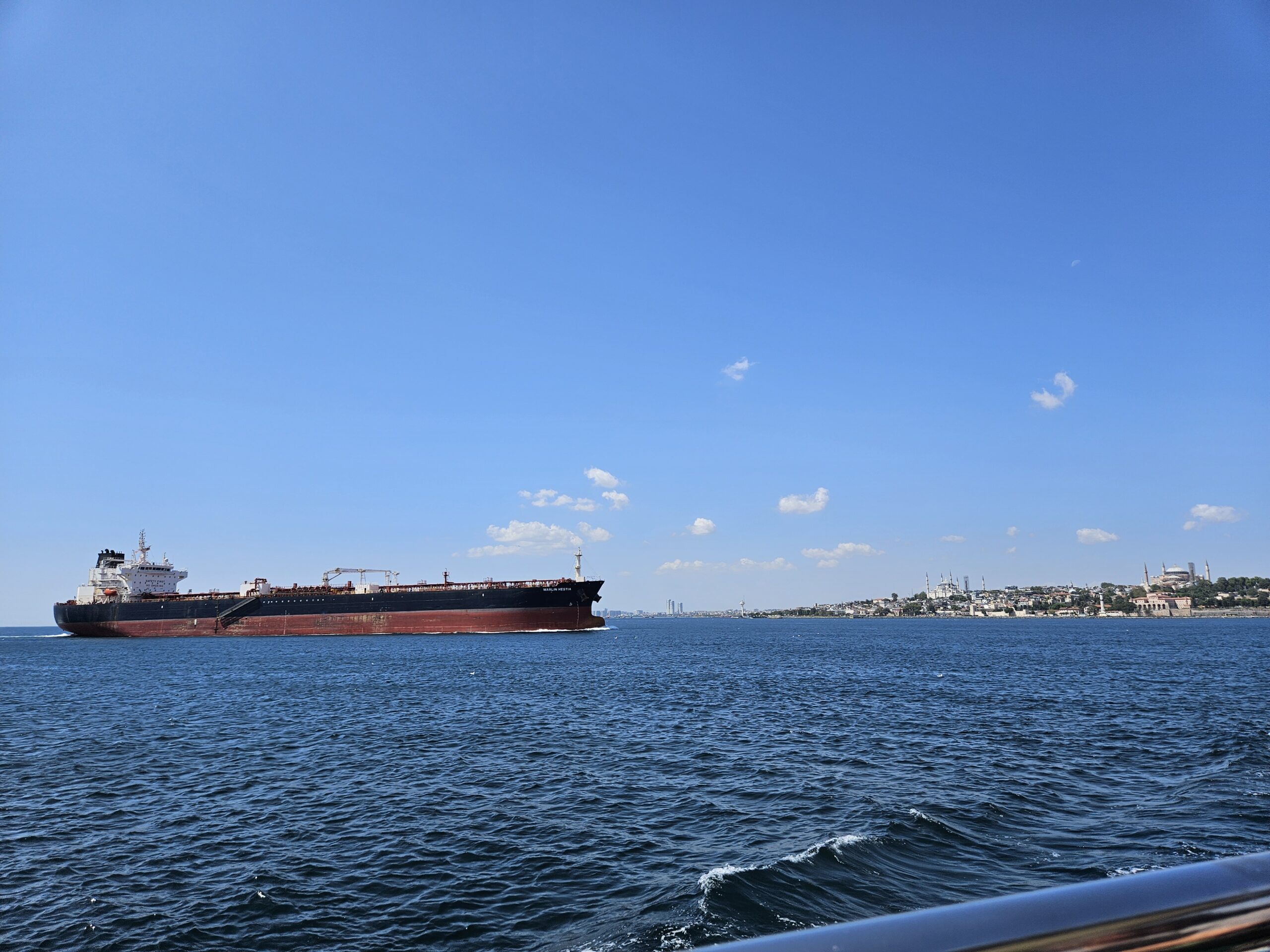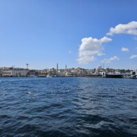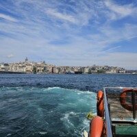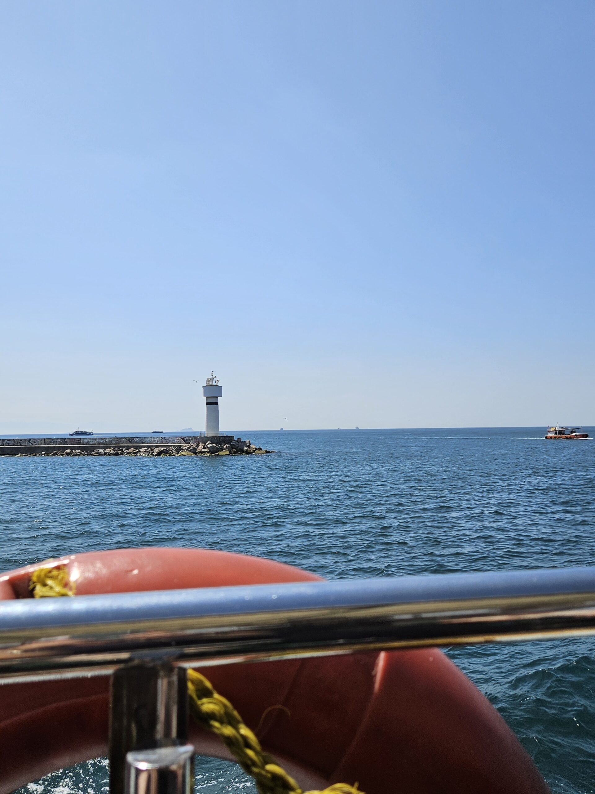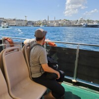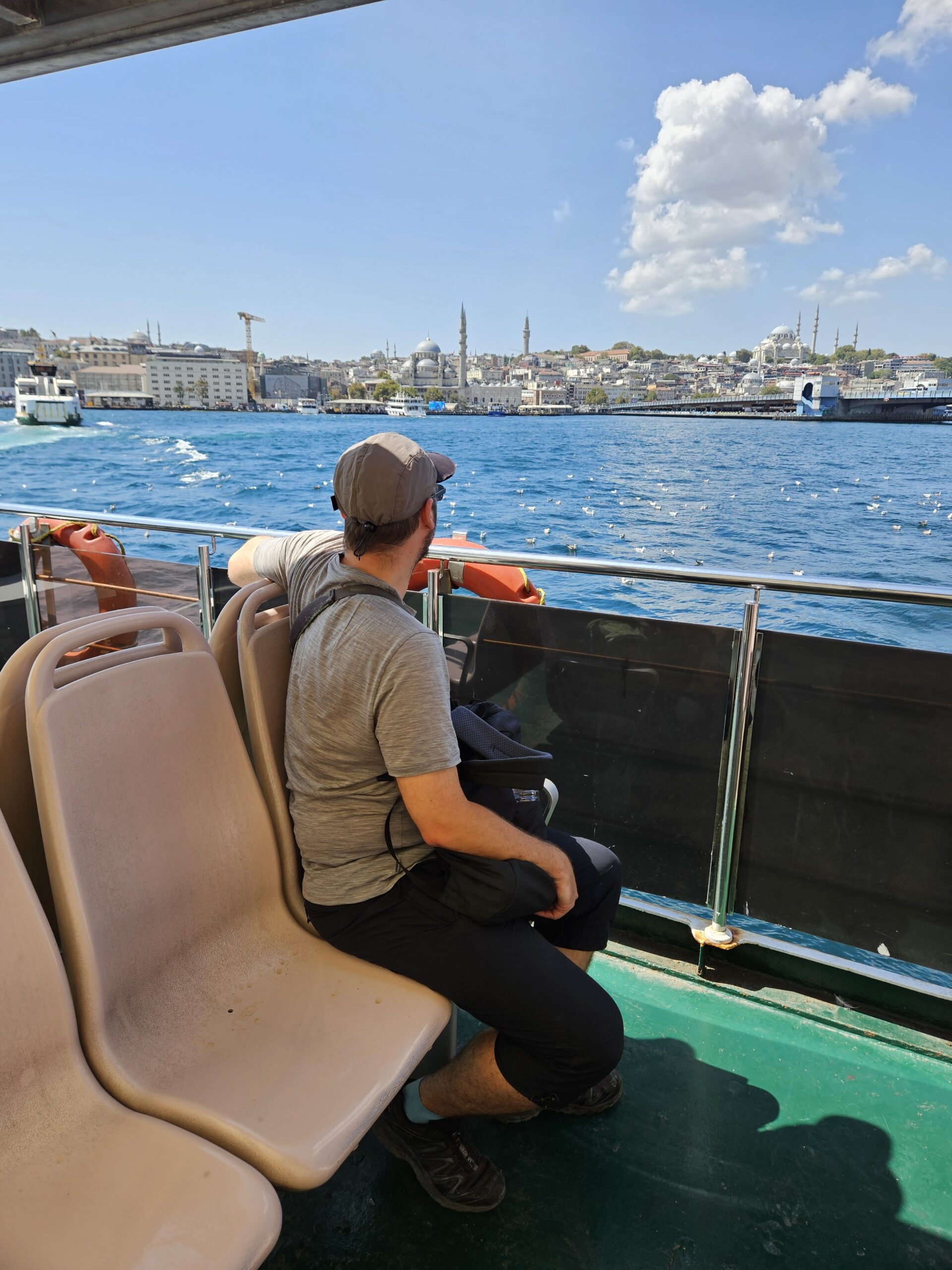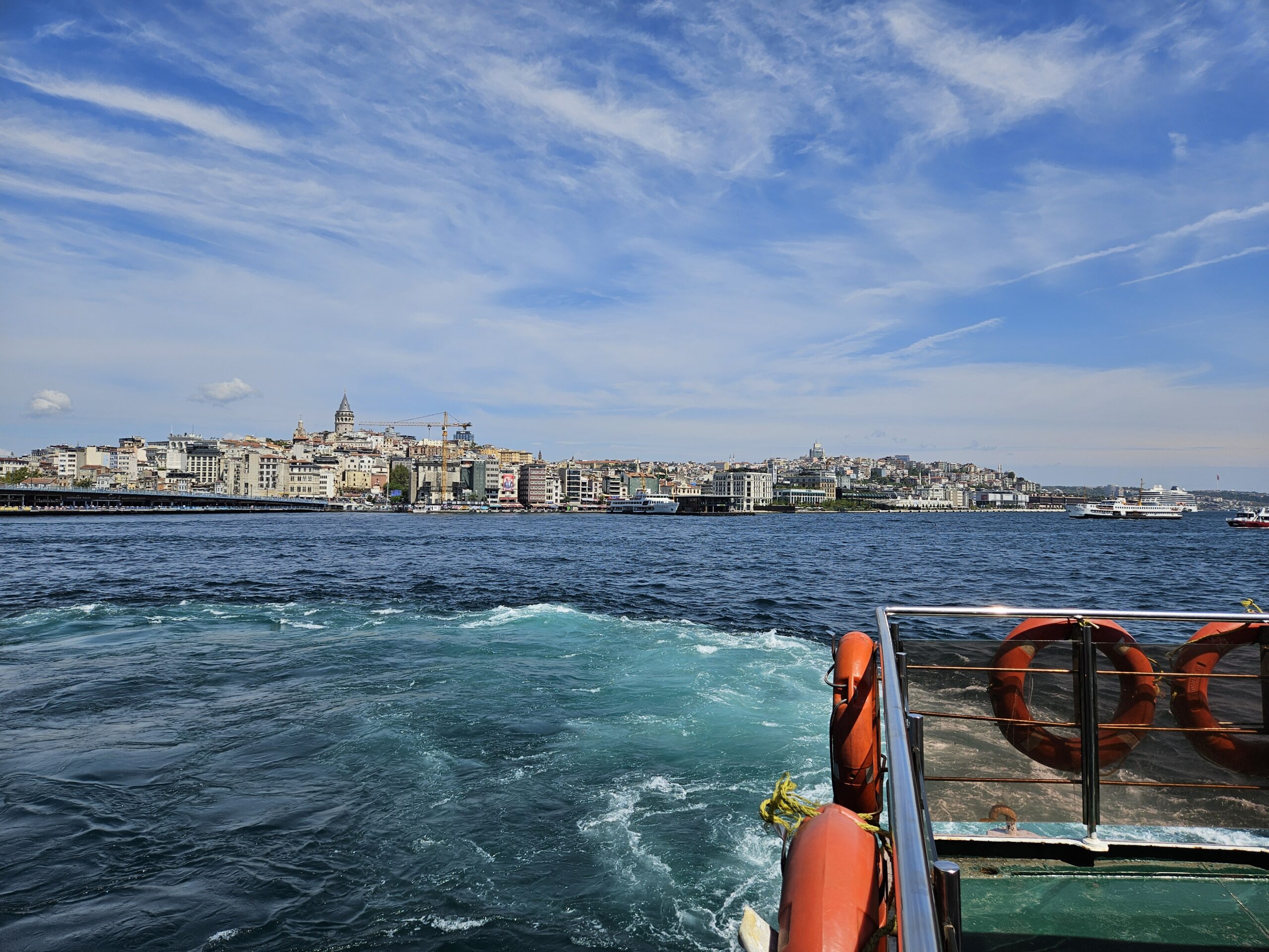 Nach diesem wunderbaren Frühstück machen wir uns, gestärkt für den Tag, auf. Zum Tünel mit der F2-Metro hinunter nach Karaköy. Dort spazieren wir zum Fährhafen und nehmen die Fähre. Spontan entscheiden wir, nicht schon bei Eminönü auszusteigen, sondern bis nach Kadıköy über den Bosporus auf die asiatische Seite Istanbuls zu schippern. Wir haben schon gute Aussenplätze, als in Eminönü die grosse Masse zusteigt. Wir geniessen die Überfahrt auf dem Aussendeck, ein angenehmes Lüftchen, Meeresbrise, ab und zu einige Spritzer Wasser 🤩🤗.