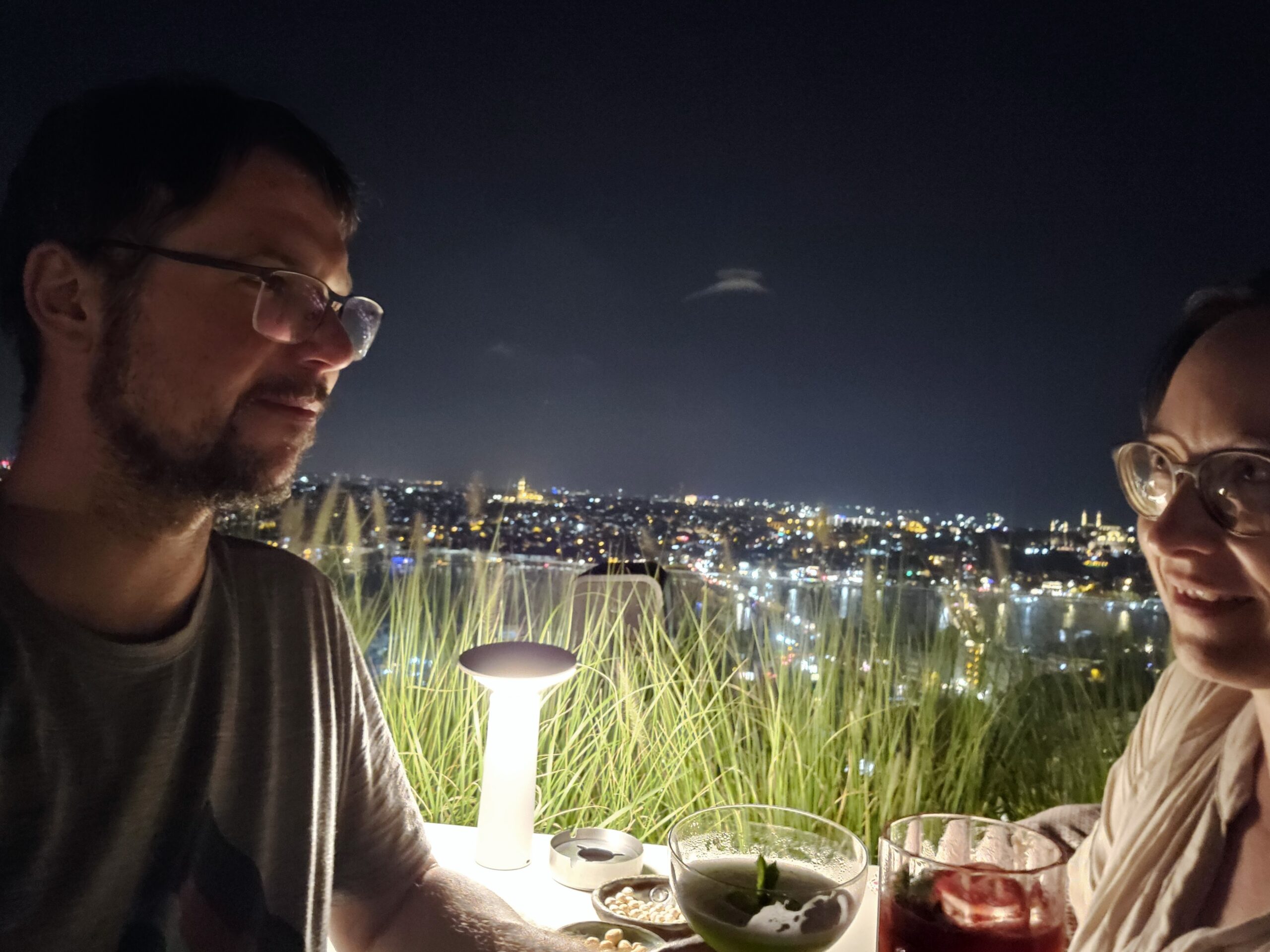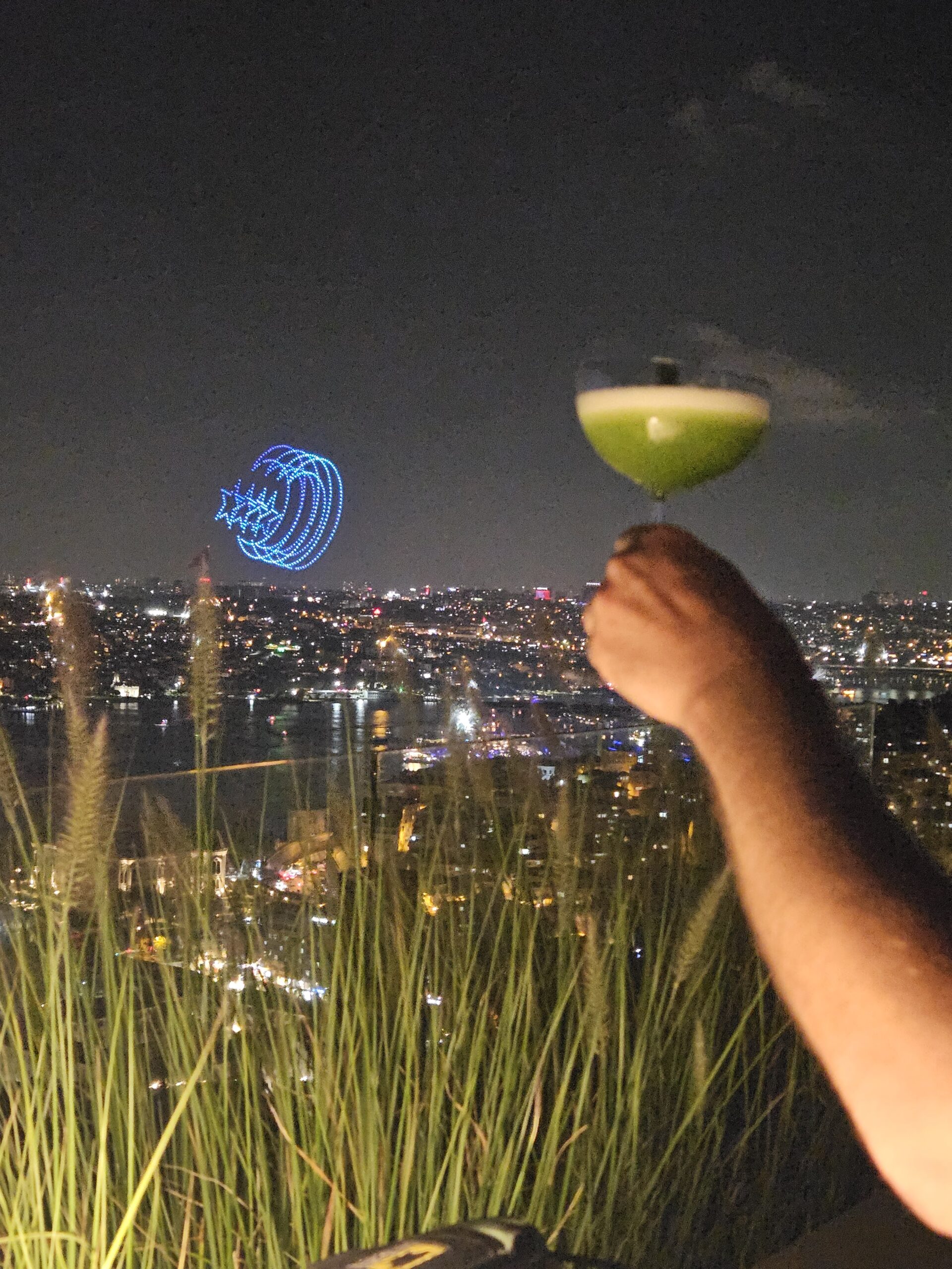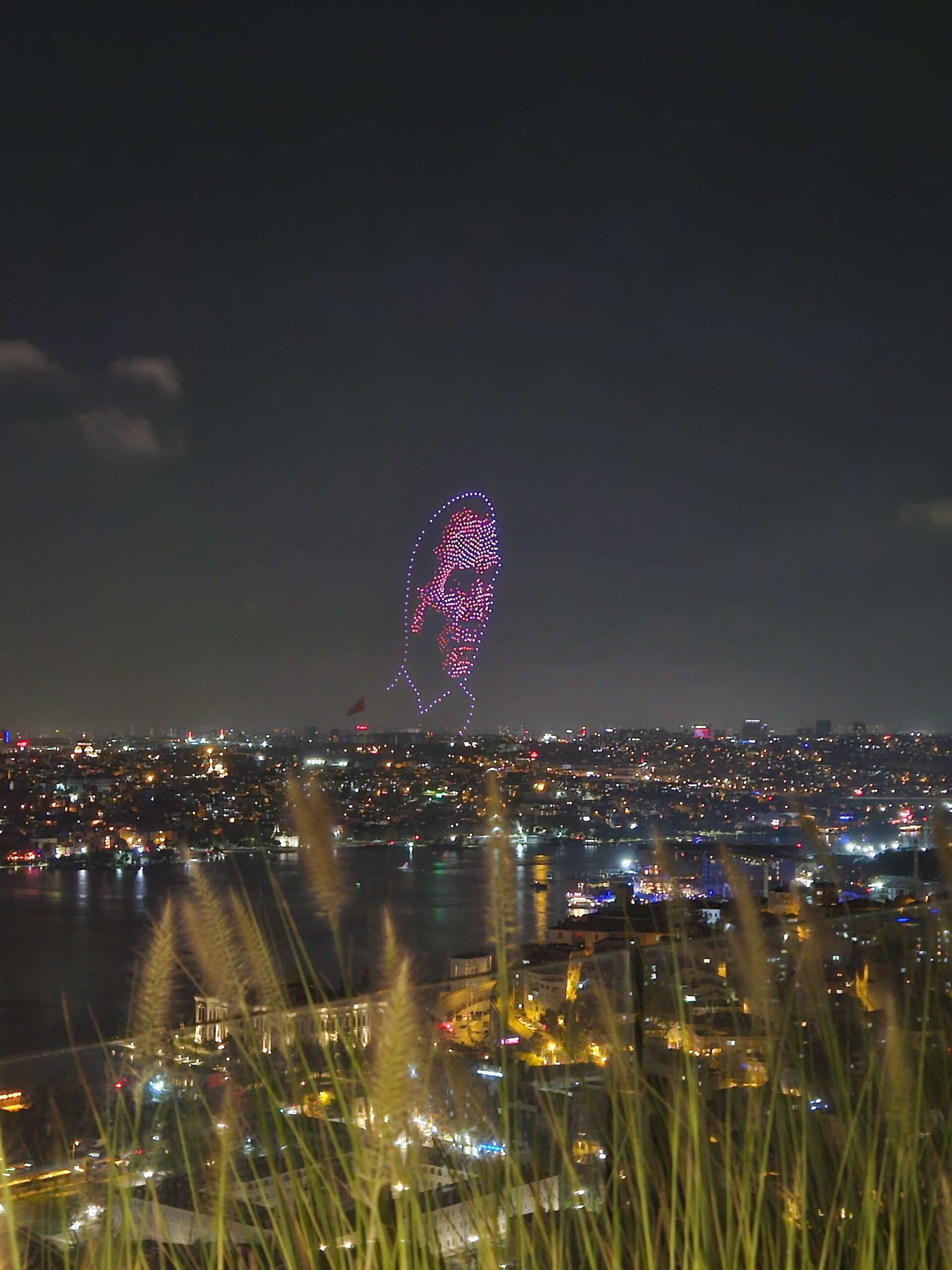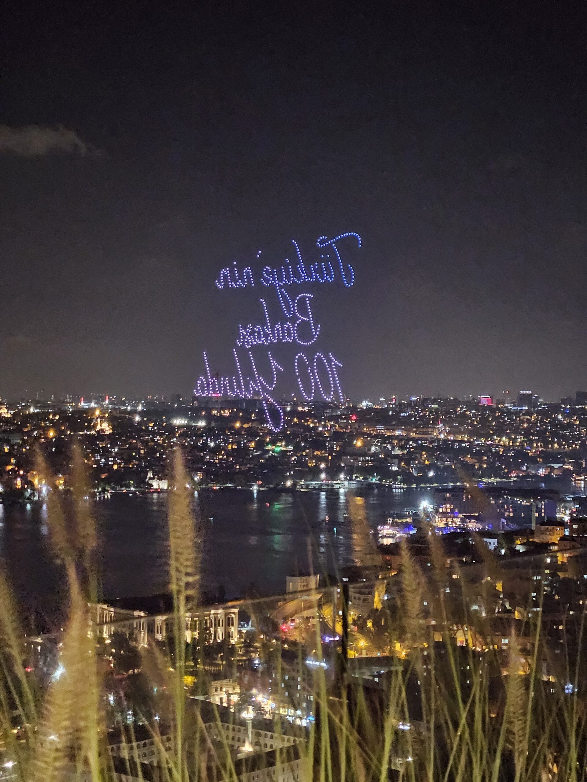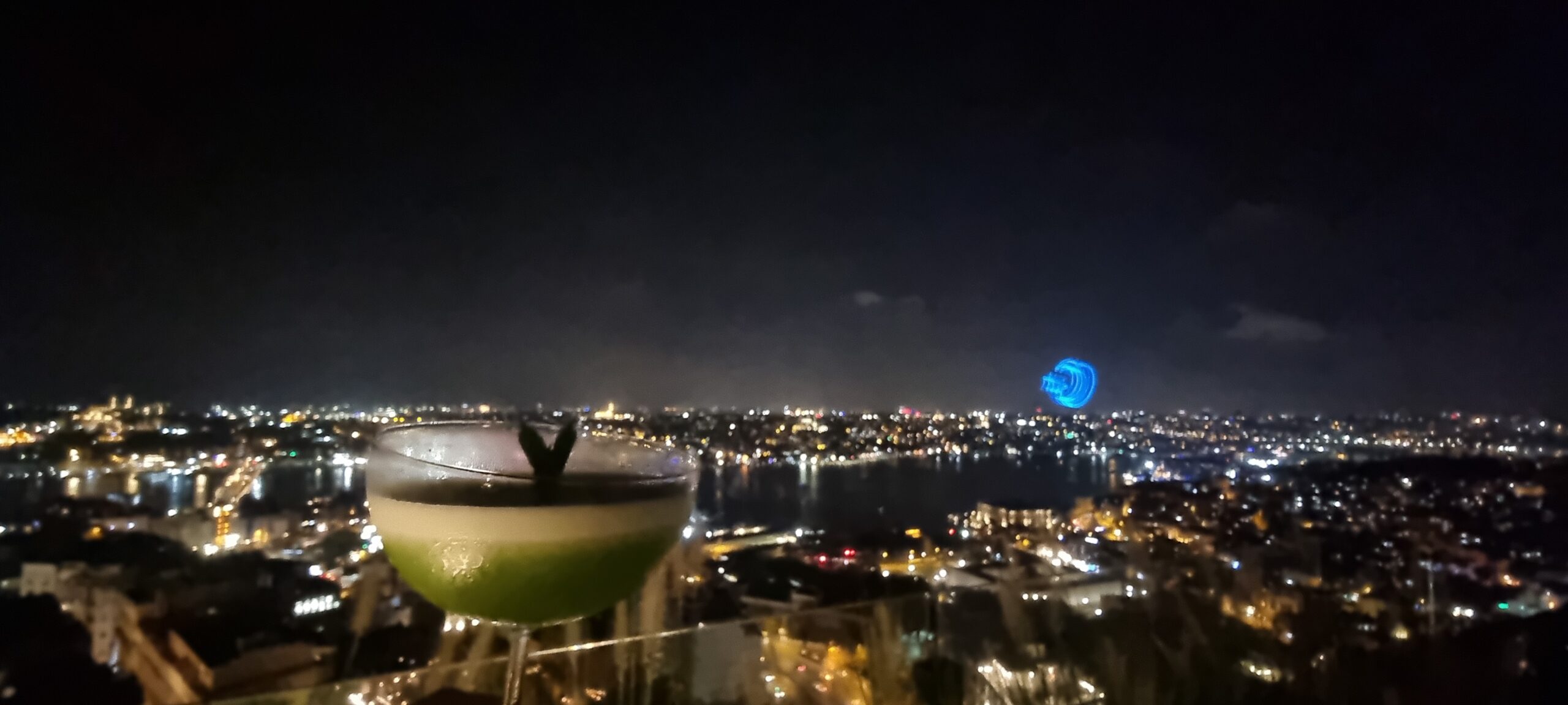 Nun, kurz vor 22 Uhr kehren wir definitiv ins Hotel zurück. Da war ja noch die Rooftop-Bar… Ein Blick kann nicht schaden und so fahren wir mit dem Lift gleich ganz nach oben. Der Ausblick auf das beleuchtete Istanbul ist grandios und so lassen wir uns auch noch auf einen kleinen Cocktail hinreissen, trotz verhältnismässig eher teureren Preisen. Wir sitzen, zufälligerweise, auch perfekt, um die Drohnenshow zum 100-jährigen Geburtstag der Türkei zu sehen. Es ist für uns beide die erste Drohnenshow und sie gefällt uns. Kein Geknalle wie bei Feuerwerk und beeindruckendes Farben- und Motivspiel.