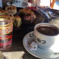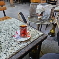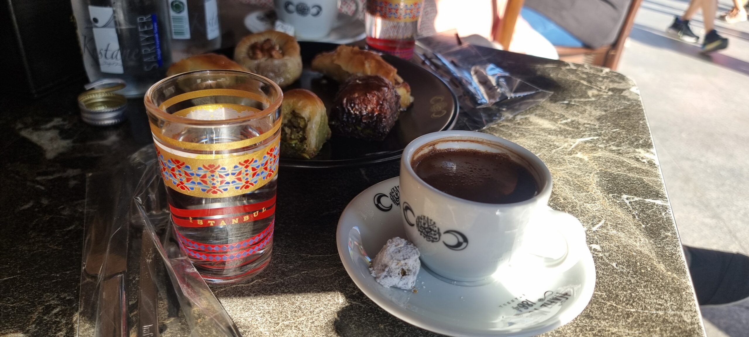 Wir streunen etwas durch die Gässchen auf der Suche nach einem türkischen Kaffee. Irgendwann setzen wir uns in eines, das zumindest türkischen Kaffee anbietet, Baklava haben sie aber nicht (viel anderes gutes Gebäck hätten sie aber…). Die Verständigung gelingt wieder trotz bedingten Englischkenntnissen, ich bekomme meinen türkischen Kaffee, Denise einen Çay. Es habe auch innen noch Plätze, wir sollen dann schauen, wird uns noch mitgeteilt. Dies machen wir bevor wir gehen, es hat wirklich auch einen sehenswerten Innenhof. Einige Schritte weiter kommen dann noch mehrere kleine Kaffees, solche, die wir eigentlich gesucht hätten. Für einen weiteren Kaffe ist es aber zu früh.
