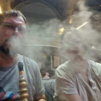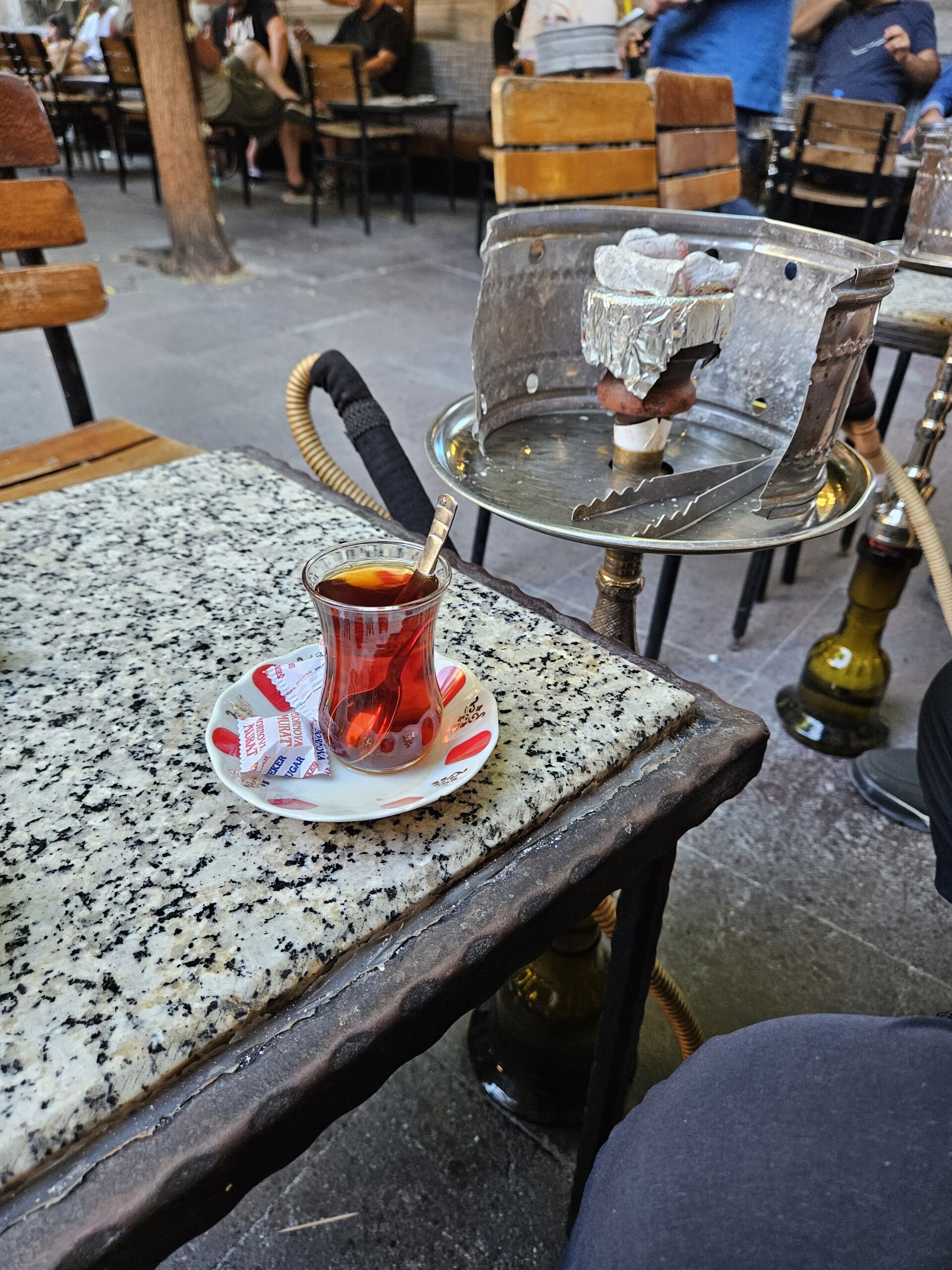 Wir finden einen Ausgang und verlassen den Grossen Basar wieder. Wir spazieren etwas weiter, auf der Suche nach einem Geheimtipp aus unserem Reiseführer (Glücksorte in Istanbul). Nach etwas Suchen finden wir den Ort, Erenler Nargile… wir setzen uns und bestellen Tee und eine Wasserpfeife, Strawberry 😊. Es ist wieder wie eine andere Welt, eine andere Zeit. Es sind nur wenige Frauen da und noch weniger Touristen. Wir geniessen die Nargile, der Wechsel der Kohle klappt bei uns anfangs nicht ganz so, wie bei den umliegenden, nach einiger Zeit erhalten wir dann auch ein wenig mehr Aufmerksamkeit. Auch hier herrscht emsiges Treiben, immer wieder geht jemand mit Çay oder Wasser herum, andere kommen mit frischer Kohle, so ist immer für optimale Entspannung gesorgt 😃. Am Ende haben wir beide je drei Çay getrunken und die Nargile in diesem authentischen Ambiente genossen.