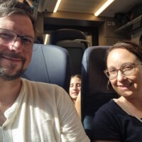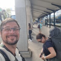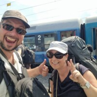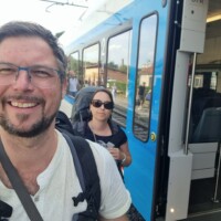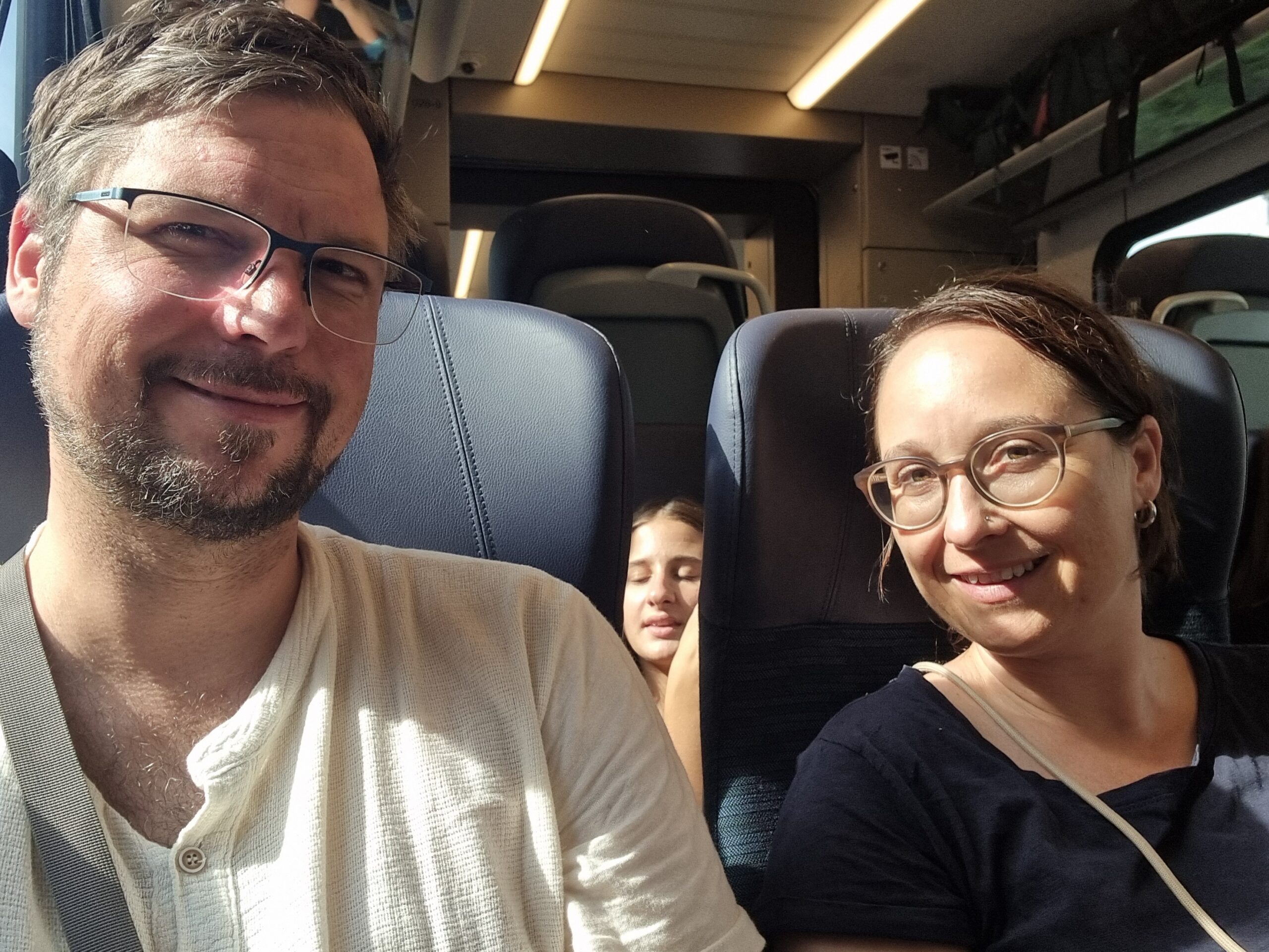 Etwas mehr wie eine Stunde haben wir noch, etwas Essen beim Bäcker geholt (da wurde mit uns plötzlich auf Englisch kommuniziert… ist unser Deutsch so schlecht?), ein Börek mit Käse, eines mit Kartoffeln. Wir gehen zurück zum Bahnhof und essen da hungrig unser Mittagessen. Und nutzen das freie Bahnhofs-WiFi auch gleich für die Hotelbuchung. Um etwa 14.30 Uhr gehen wir zum Bahnsteig und steigen in den modernen Stadlerrail-Zug ein. Klimatisiert.
